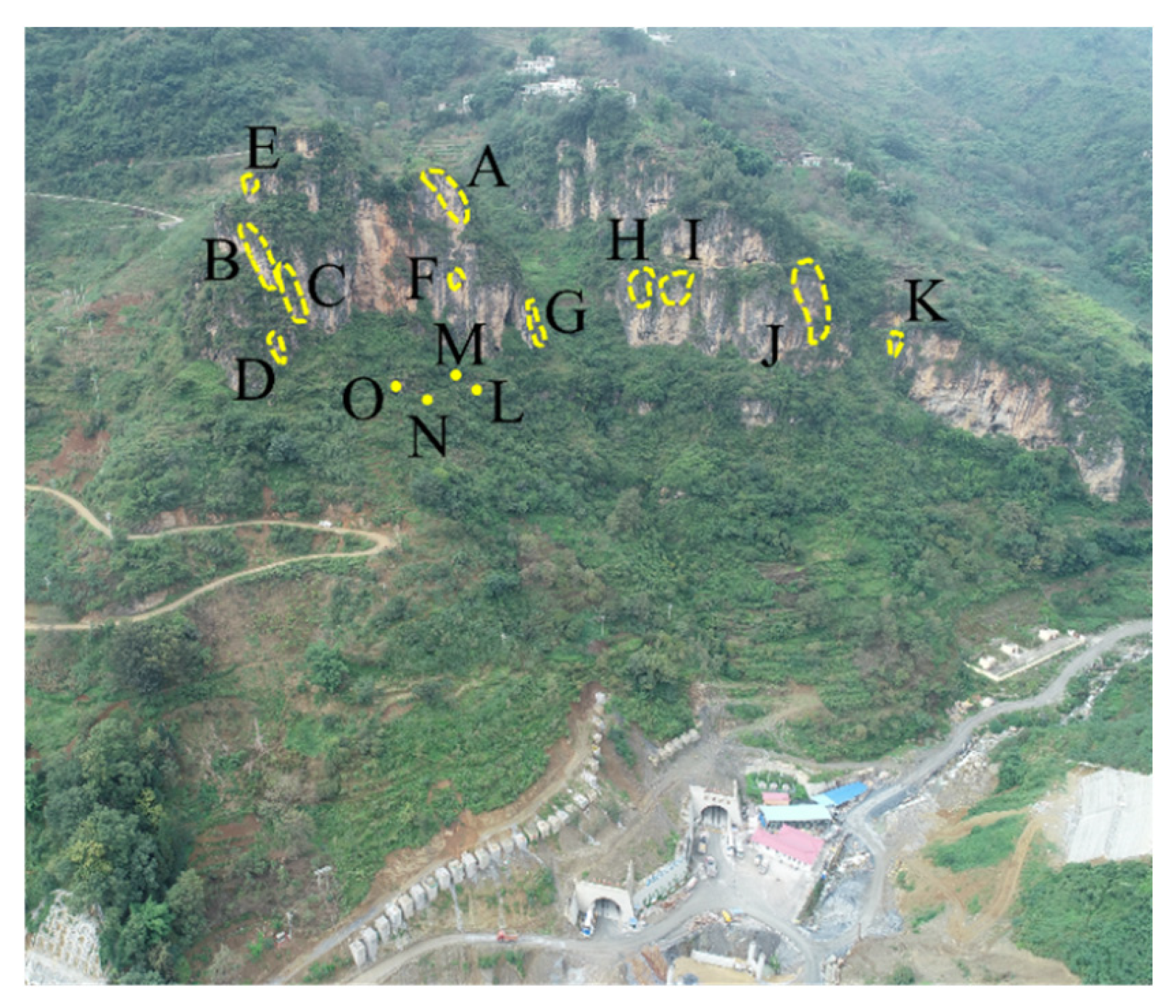 - Han, Z.; Chen, X.; Wang, X.; Zhao, T.; Zhou, J.; Zhang, L. Risk Assessment for Luojiaqinggangling Rockfall. J. Eng. Geol. 2017, 25, 520–530. [Google Scholar] [CrossRef]