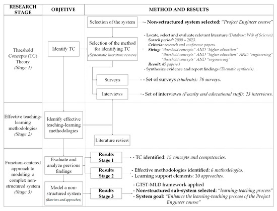This section describes the research design, stages, and analytical methods applied to develop the GTST-MLD model for representing complex non-physical systems. The methodological process integrates a mixed approach, combining literature-based, qualitative, and quantitative analyses to identify TCs, map teaching–learning methodologies supported by empirical and literature-based evidence, and construct a function-centered model of the teaching–learning process.