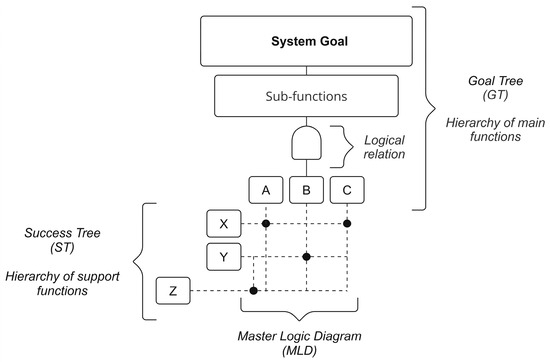 GTST modeling provides a hierarchical structure of system goals (Goal Tree, GT) and success conditions (Success Tree, ST) that together represent both objectives and the dependencies required for their achievement [2,15,30]. The addition of the Master Logic Diagram (MLD) simplifies dependencies within GT-ST relationships [31], representing links between main and support functions, as well as between primary and auxiliary elements [16,32]. This structure enhances failure detection and system visualization in environments with multiple interdependent subsystems [4,15]. As highlighted by Ref. [16], the fundamental idea behind the GTST modeling framework originated from risk analysis in nuclear power plants during the 1980s [33] and process control in industrial facilities [18,34]. Its capacity to visualize objectives, components, and interrelations has since positioned it as a powerful framework for functional decomposition.