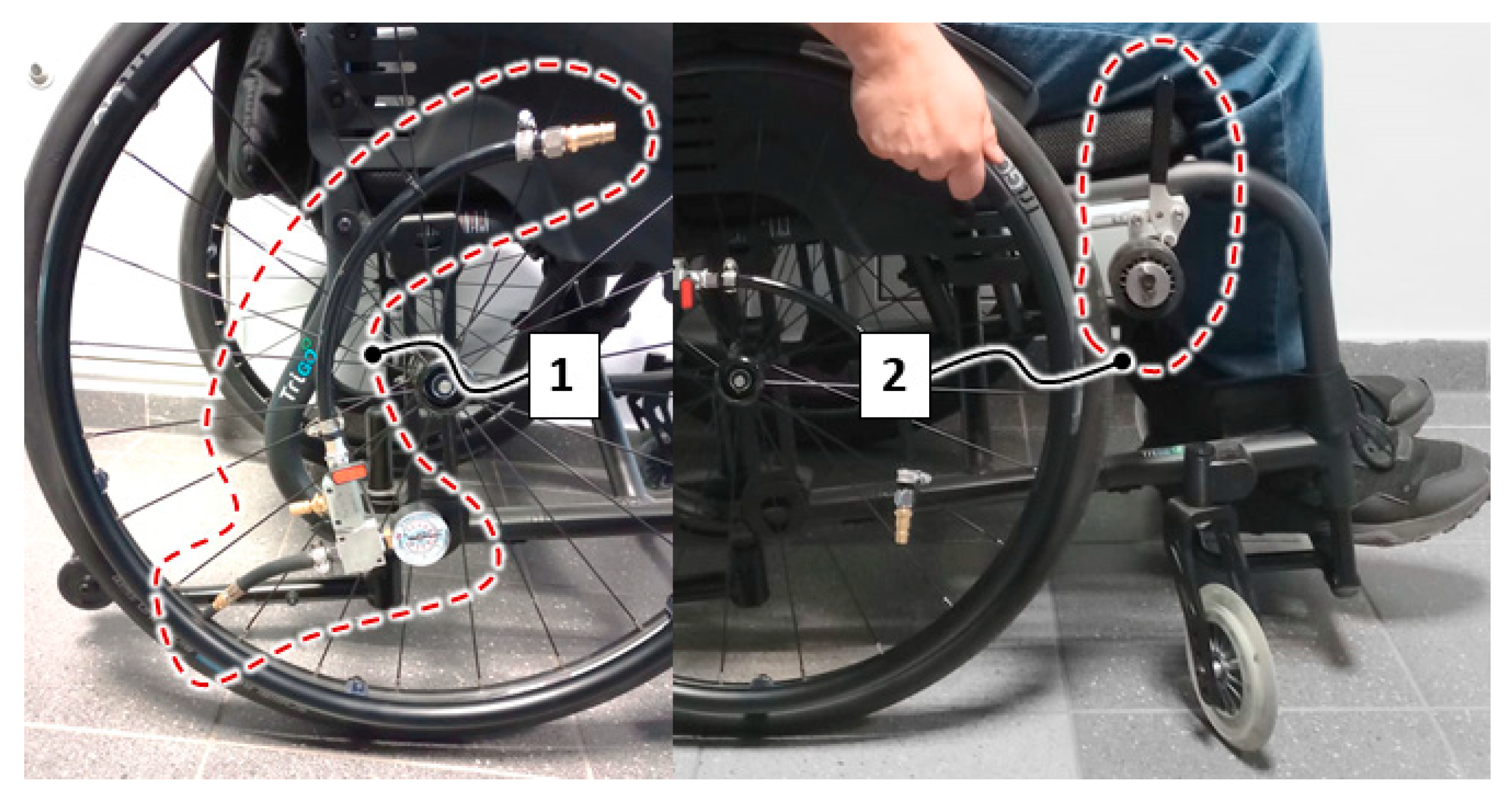 - Wieczorek, B.; Warguła, Ł.; Rybarczyk, D. Impact of a Hybrid Assisted Wheelchair Propulsion System on Motion Kinematics during Climbing up a Slope. Appl. Sci. 2020, 10, 1025. [Google Scholar] [CrossRef]