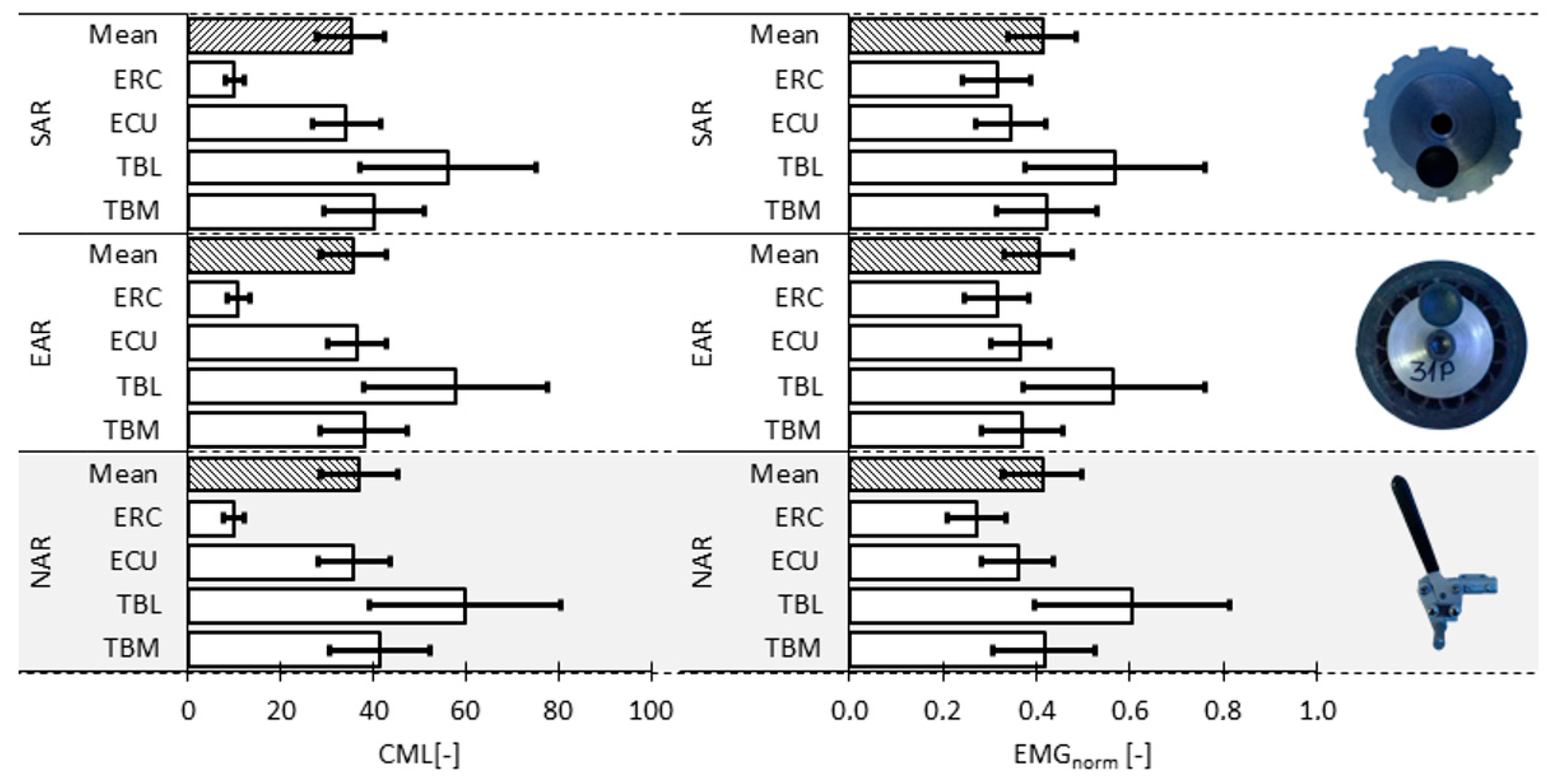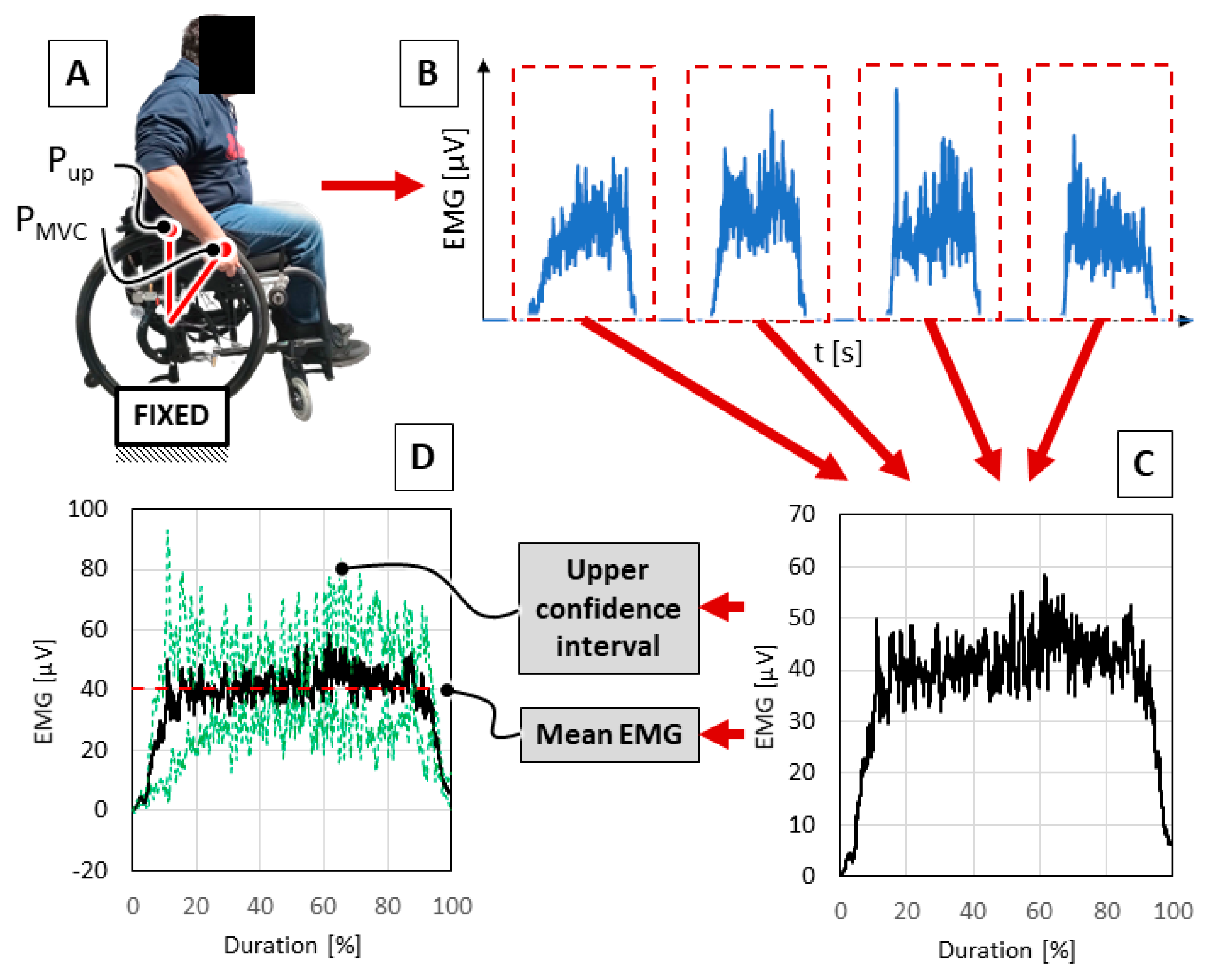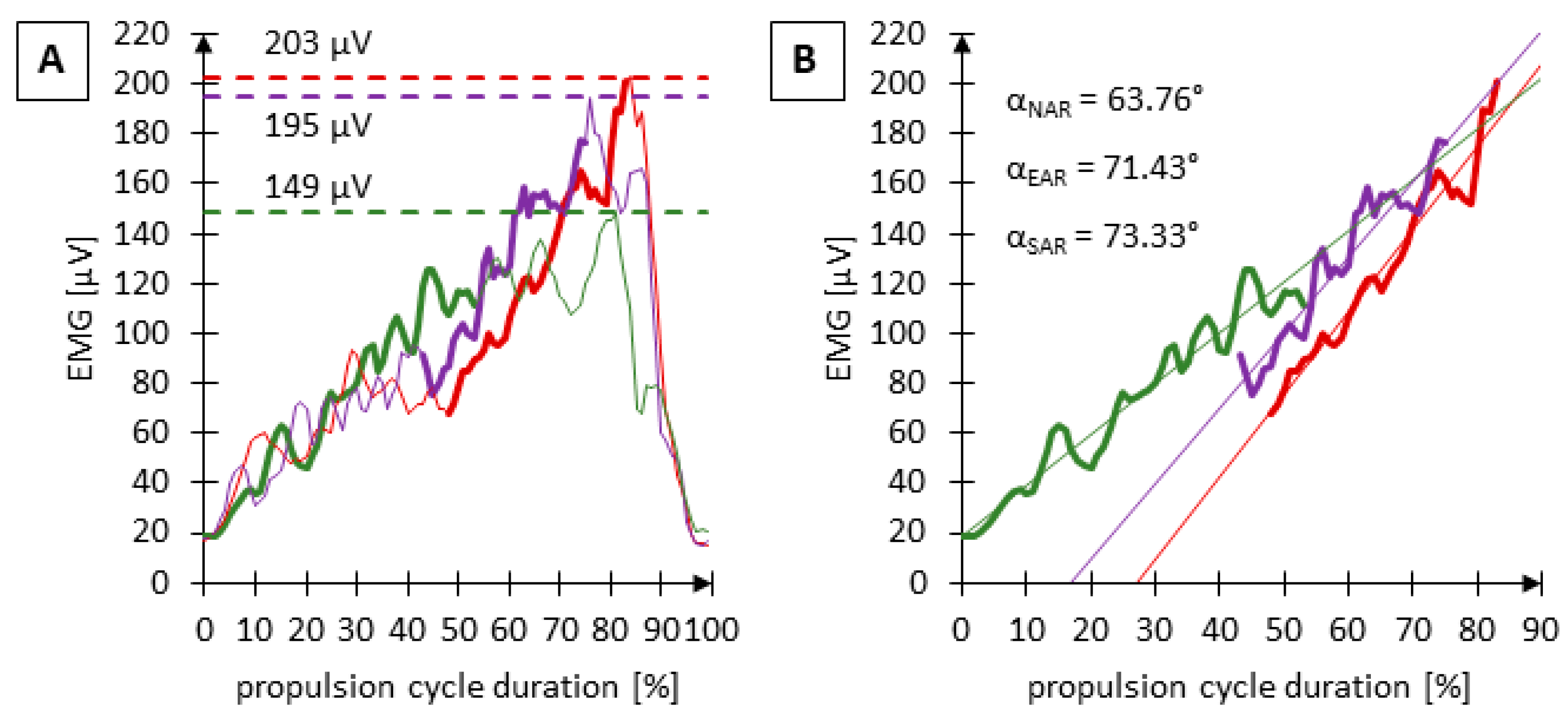 - Louis, N.; Gorce, P. Surface Electromyography Activity of Upper Limb Muscle during Wheelchair Propulsion: Influence of Wheelchair Configuration. Clin. Biomech. 2010, 25, 879–885. [Google Scholar] [CrossRef]
