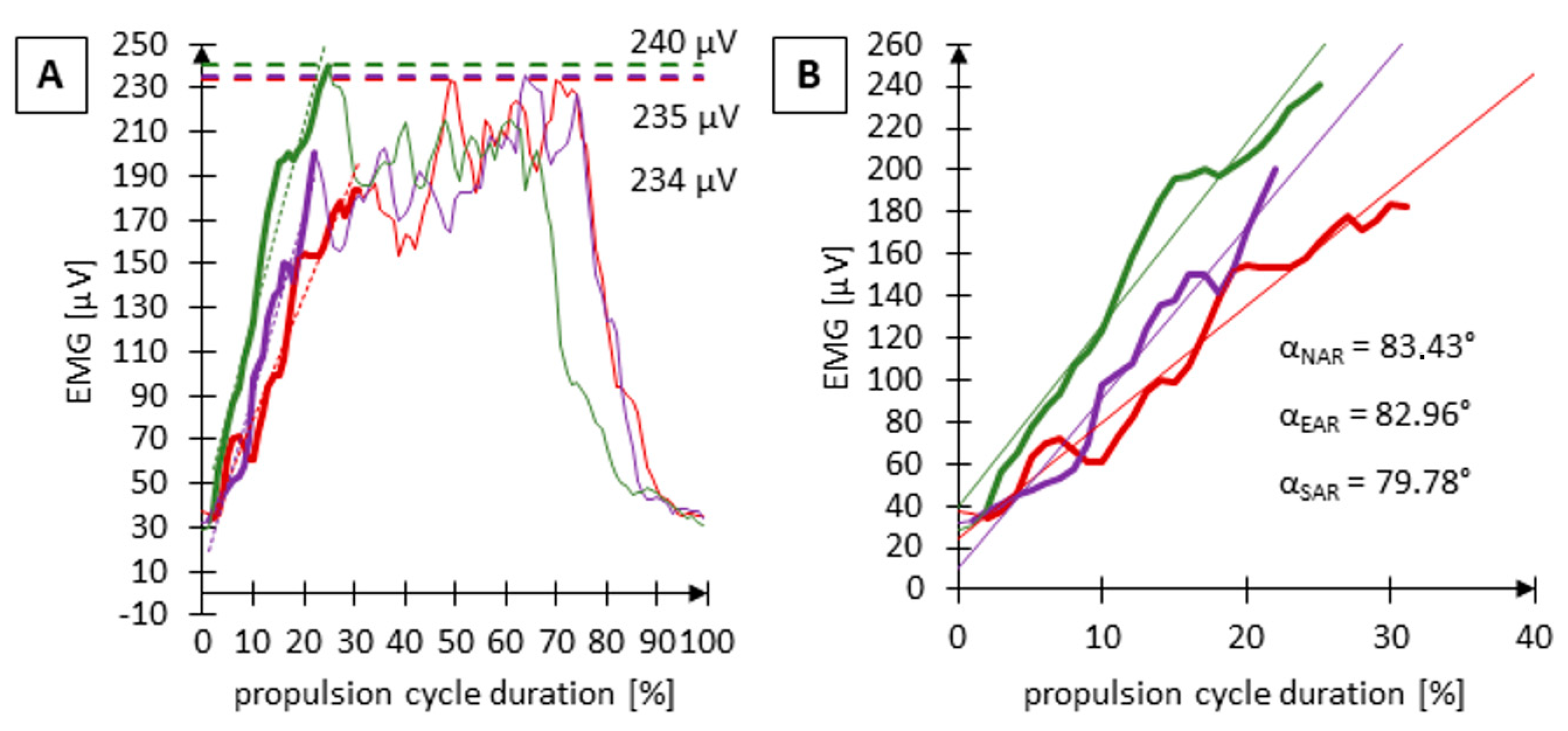 - the peak-to-mean ratio, PMR, of the EMG signal for a single propulsion cycle during uphill propulsion (section from SS to SE).