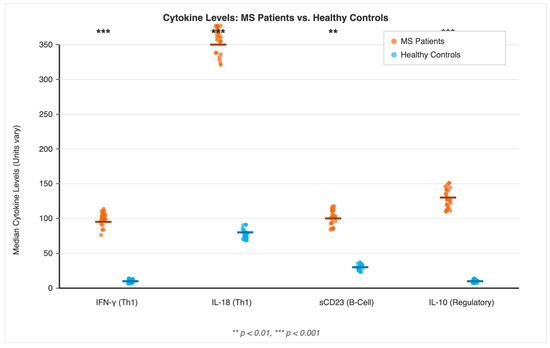 Upon stimulation of PBMCs with a pool of EBV antigens, patients with MS exhibited a significantly heightened and broad-based cytokine response compared to the control group. As visualized in Figure 1, the median levels of all four measured cytokines were markedly elevated in MS patients. The pro-inflammatory Th1 cytokines IFN-γ (MS: 98.5 units/106 cells vs. controls: 15.2 units/106 cells; p < 0.001) and IL-18 (MS: 342.7 pg/mL vs. controls: 78.3 pg/mL; p < 0.001), the B-cell. activation marker sCD23 (MS: 102.4 ng/mL vs. controls: 32.1 ng/mL; p < 0.001), and the regulatory cytokine IL-10 (MS: 135.8 units/106 cells vs. controls: 12.4 units/106 cells; p < 0.001) were all produced at significantly higher levels (p < 0.0125 for all comparisons after Bonferroni correction) in the MS cohort, indicating a state of profound immune hyper-responsiveness to the virus during relapse.