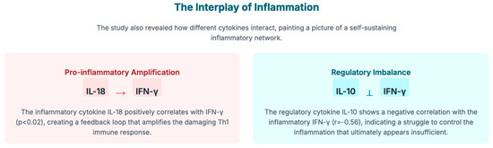 Further analysis of the relationships between the cytokines revealed a dysregulated network (Table 1). A significant positive correlation was observed between the two key Th1 inflammatory cytokines, IFN-γ and IL-18 (r = 0.51, p = 0.02), suggesting a synergistic feed-forward loop that may amplify and sustain the inflammatory cascade. In contrast, a significant negative correlation was found between the regulatory IL-10 and the inflammatory IFN-γ (r = −0.56, p < 0.01). This inverse relationship suggests an ongoing but ultimately insufficient compensatory attempt by the regulatory arm of the immune system to counteract the powerful Th1-driven inflammation characteristic of active MS relapses.