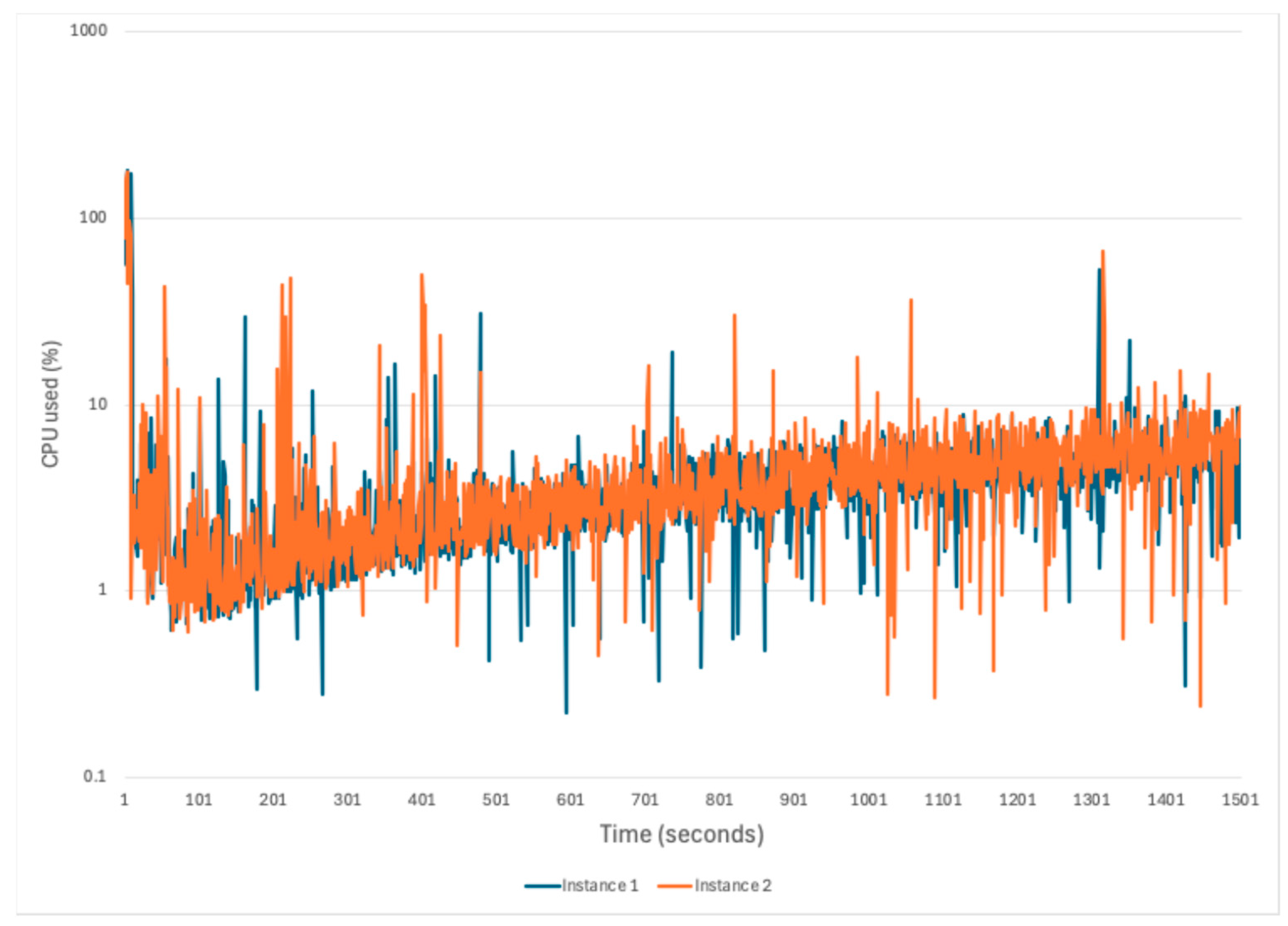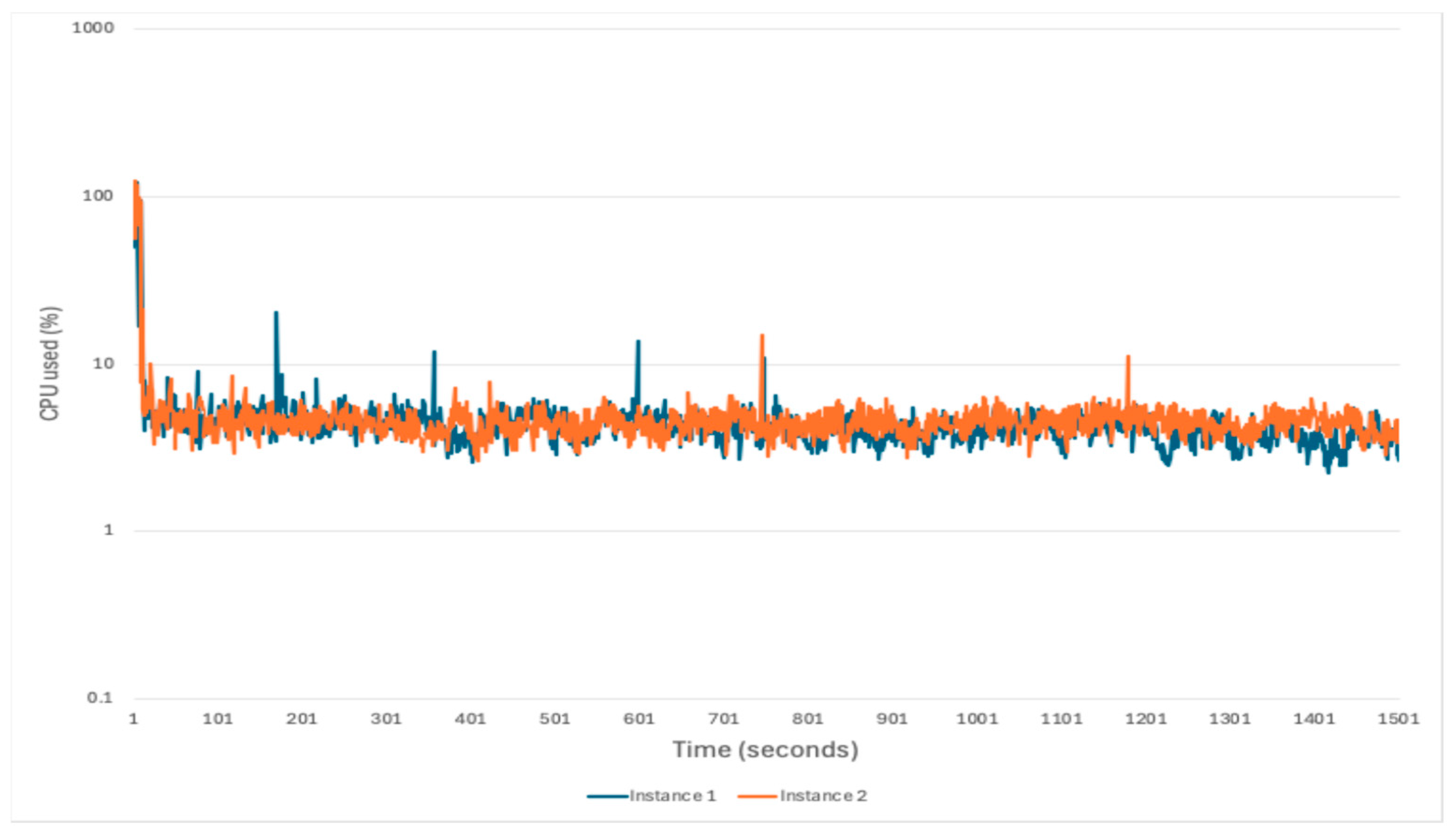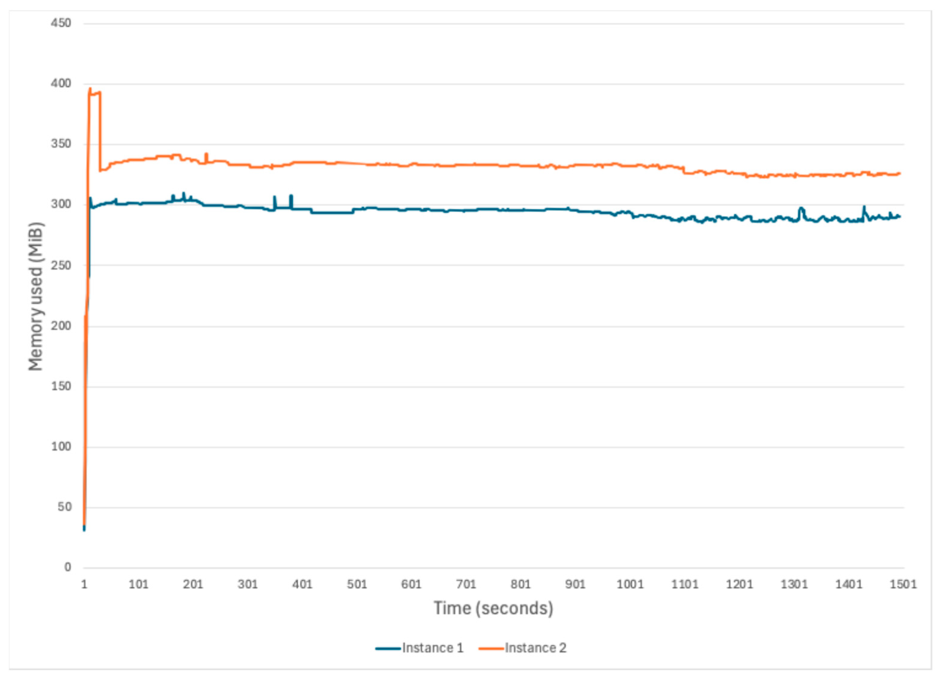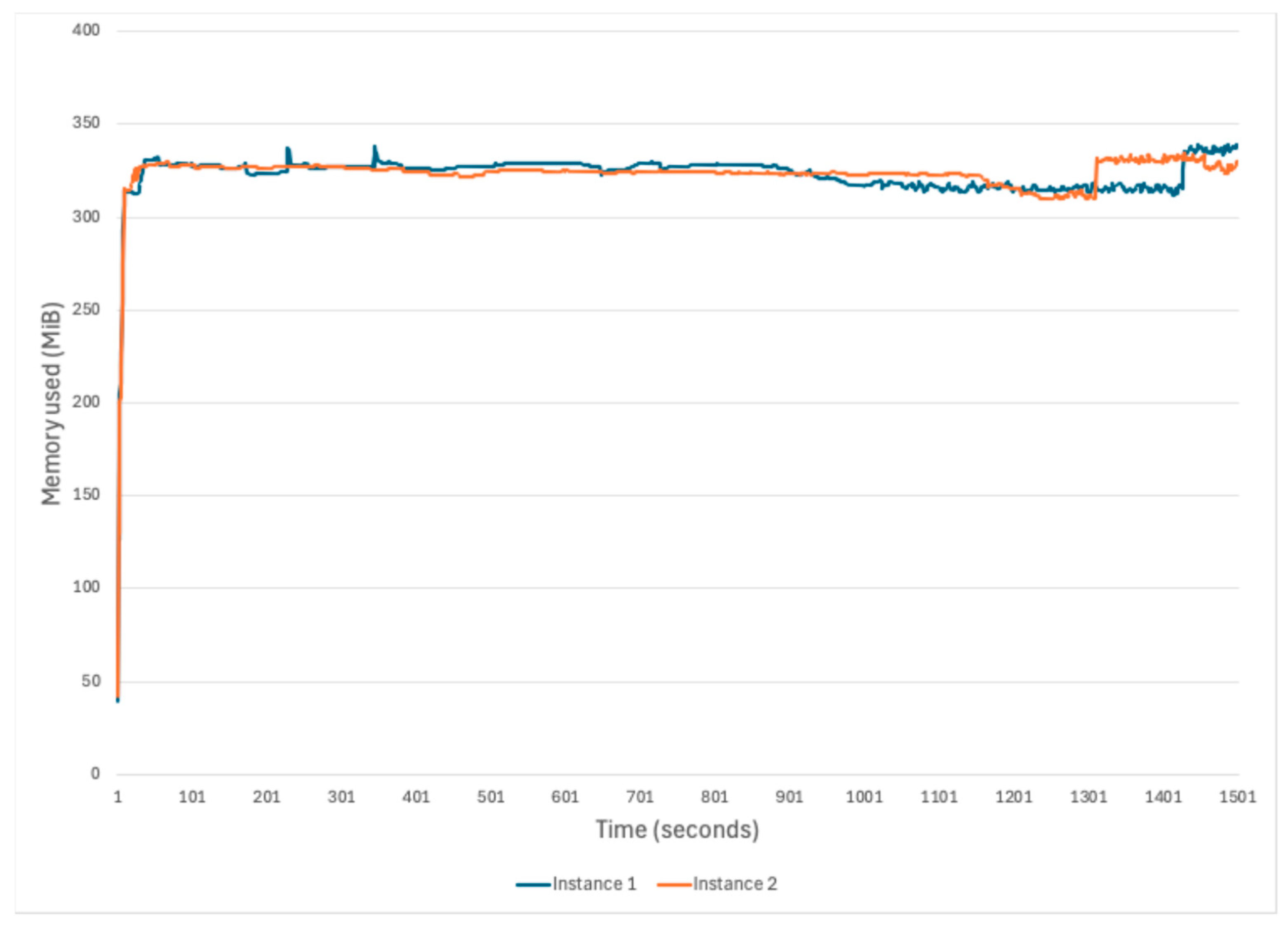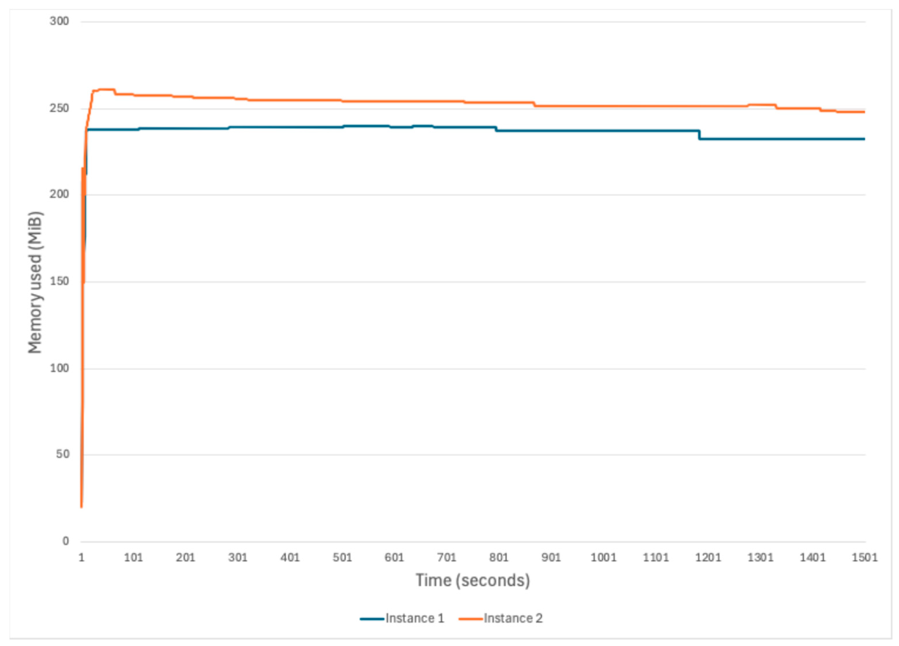 Figure 11. The data from all the runs is available in the annexes. Across all runs, we measured memory consumption (excluding initialization in the first 60 s) to have an average of 245.45 MiB, a median of 242.70 MiB, and a standard deviation of 7.55 MiB, signaling relatively constant memory consumption. Similarly, CPU consumption had an average of 3.94%, with a median of 3.98% and a standard deviation of 1.01%.