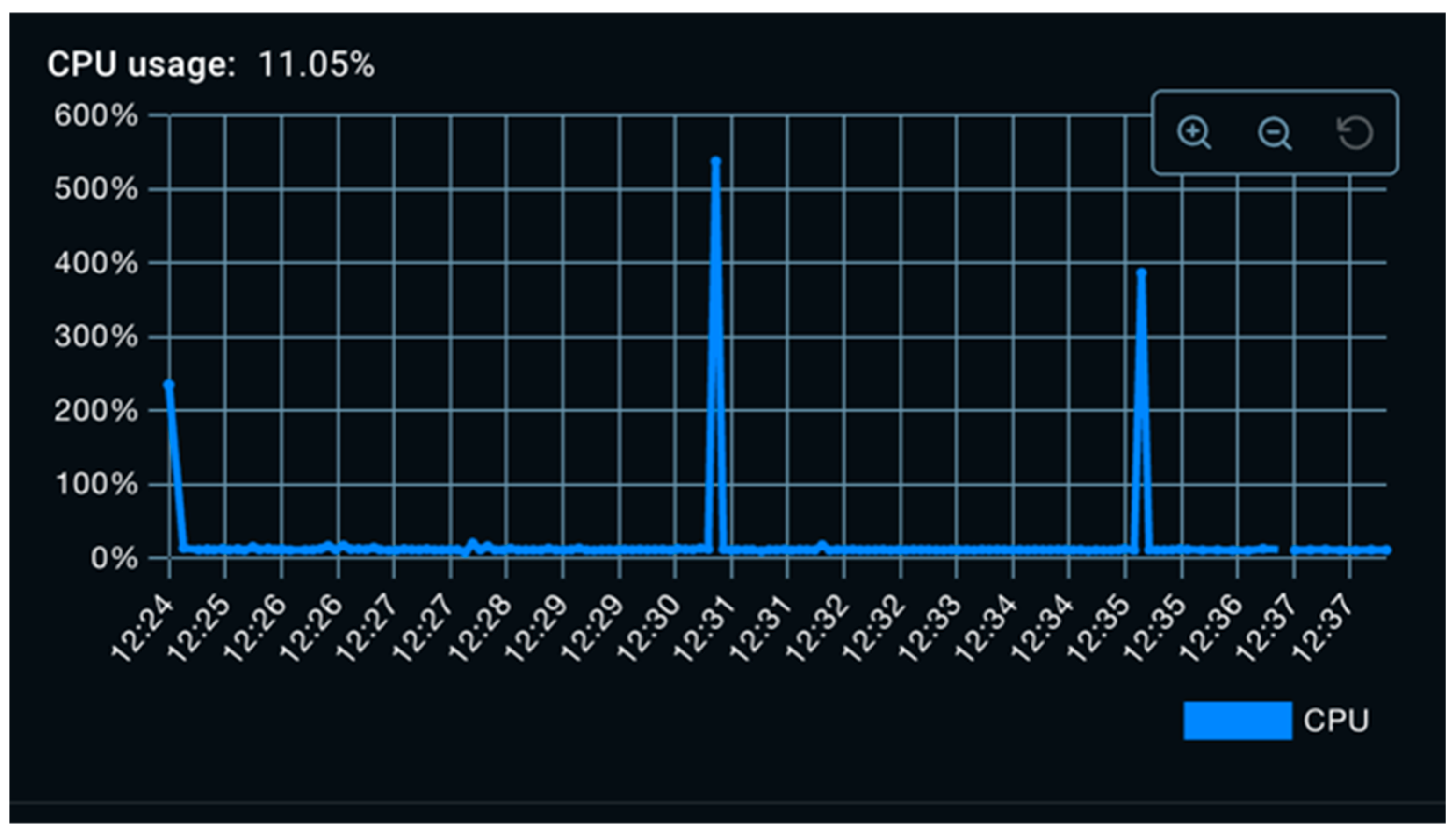 To intensify the load, the metric production interval was reduced to 40 ms. Under this configuration, the average CPU usage increased to approximately 4.59%, with a median of 4.06% and a standard deviation of 3.27% (