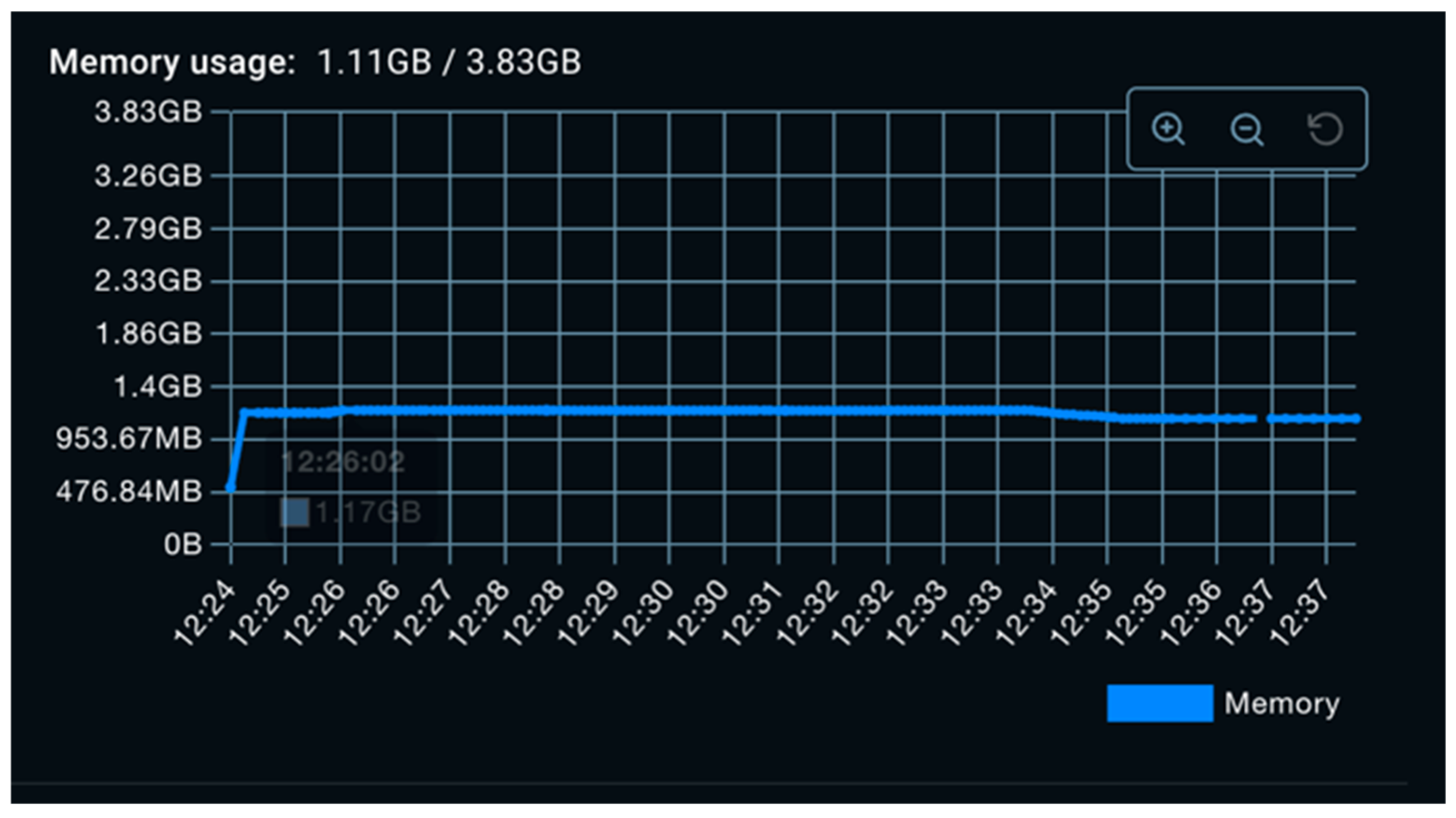 Figure 12). Memory usage surged from approximately 200 MB to 1.2 GB, as shown in