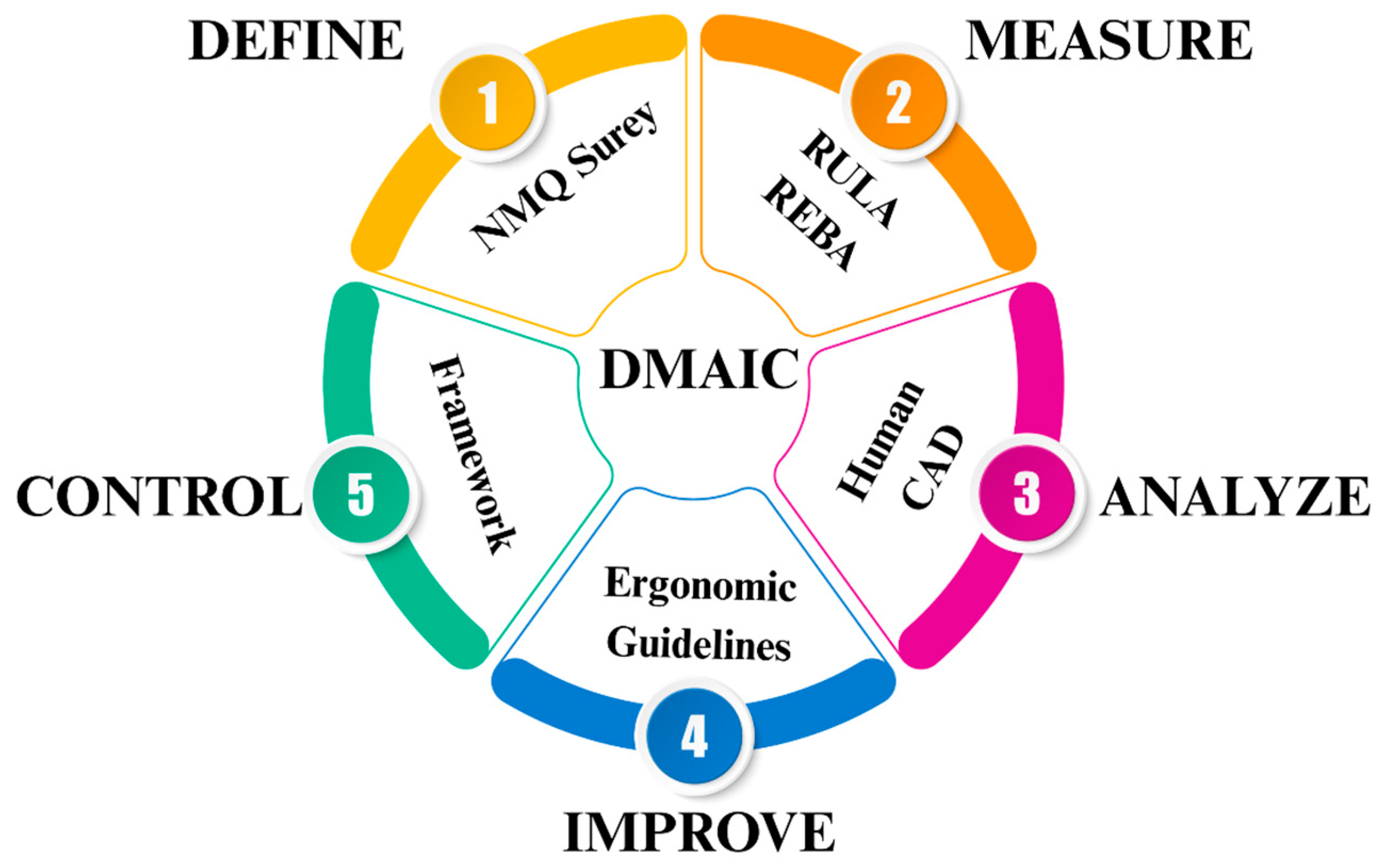 17]. Structured problem-solving approaches like the DMAIC methodology from Six Sigma are further employed to define, measure, analyze, improve, and control processes for continuous ergonomic optimization [
