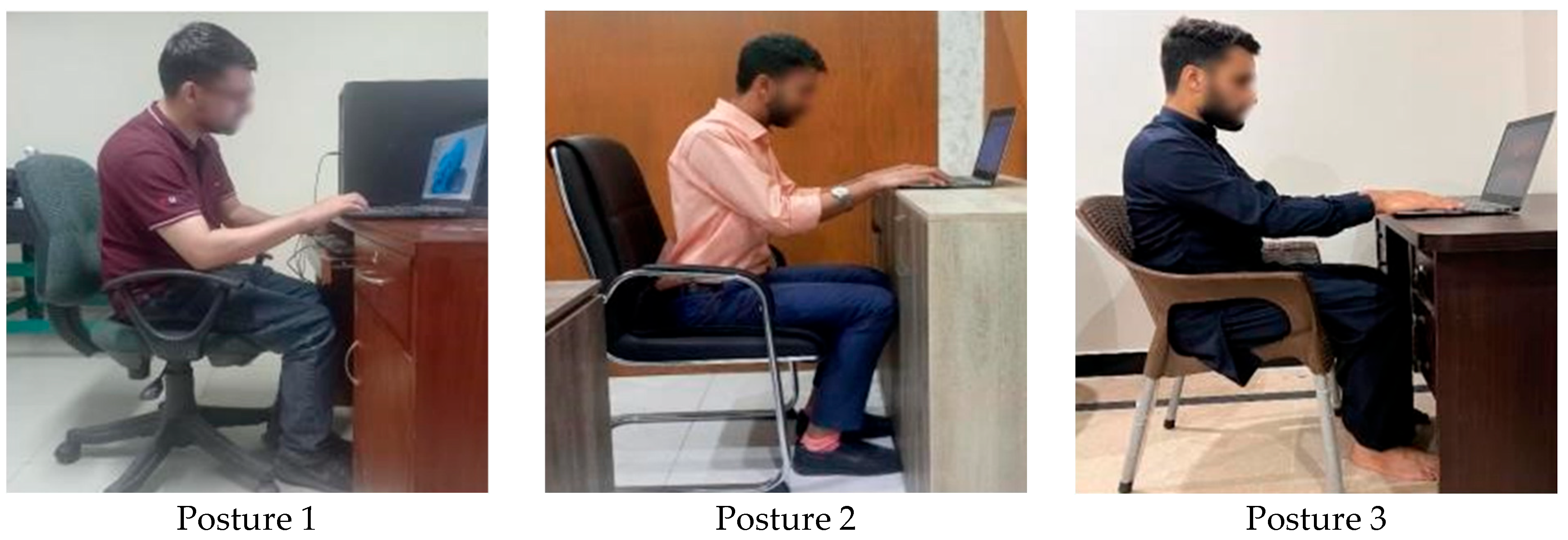 The data collection process was conducted across multiple environments where construction management professionals typically work, including permanent offices, temporary site facilities, and field locations. Each participant was observed during regular working activities for three sessions of 45 min each, scheduled to capture different times of day and work contexts. Video recordings of work postures were obtained with participant consent, supplemented by still photographs for posture assessment purposes, as shown in