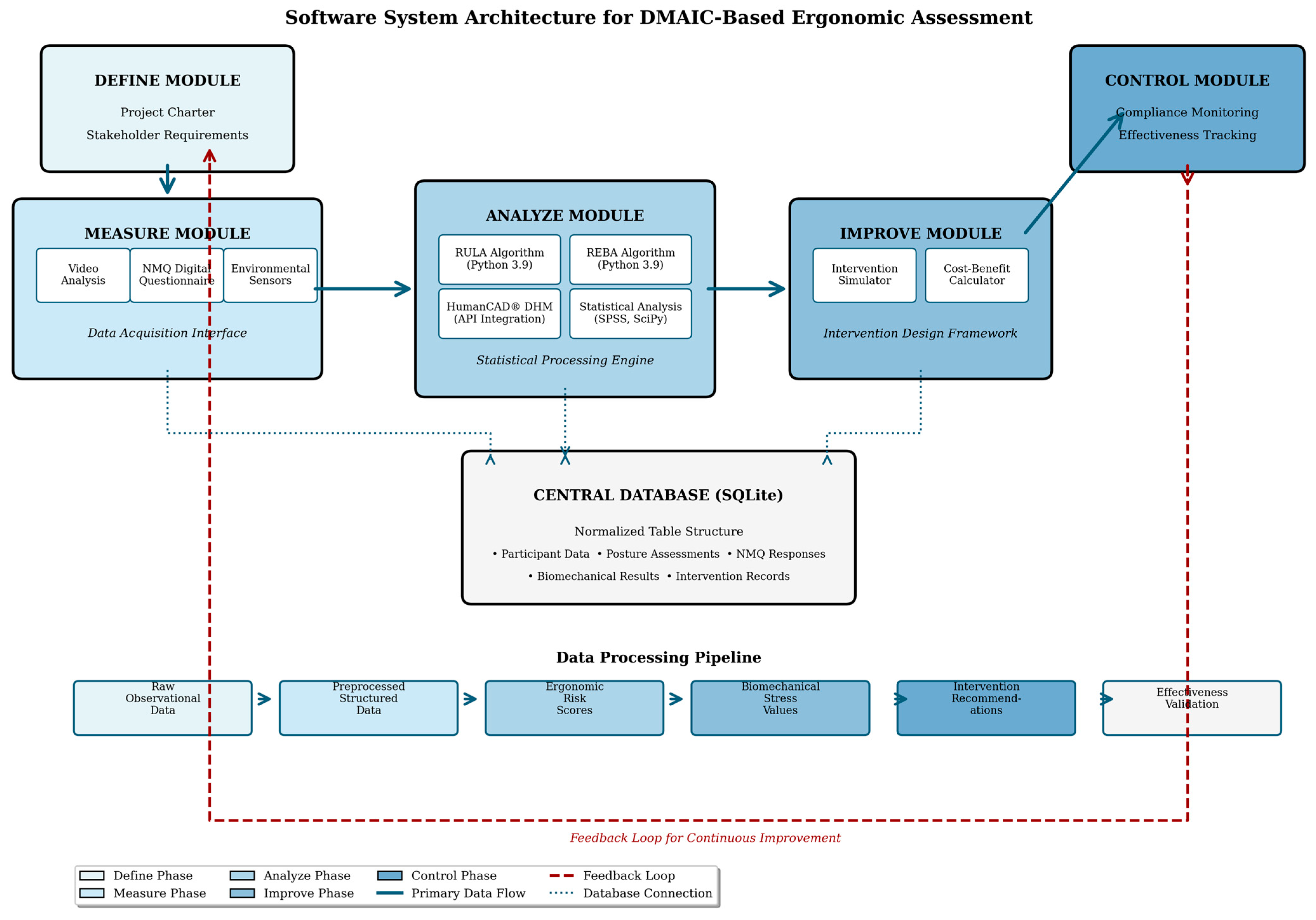 Figure 4. The system comprises five modules: Define Module (project charter management), Measure Module (data acquisition from video analysis, NMQ questionnaires, environmental sensors), Analyze Module (RULA/REBA algorithms, DHM integration, statistical processing), Improve Module (intervention simulation, cost–benefit analysis), and Control Module (compliance monitoring).