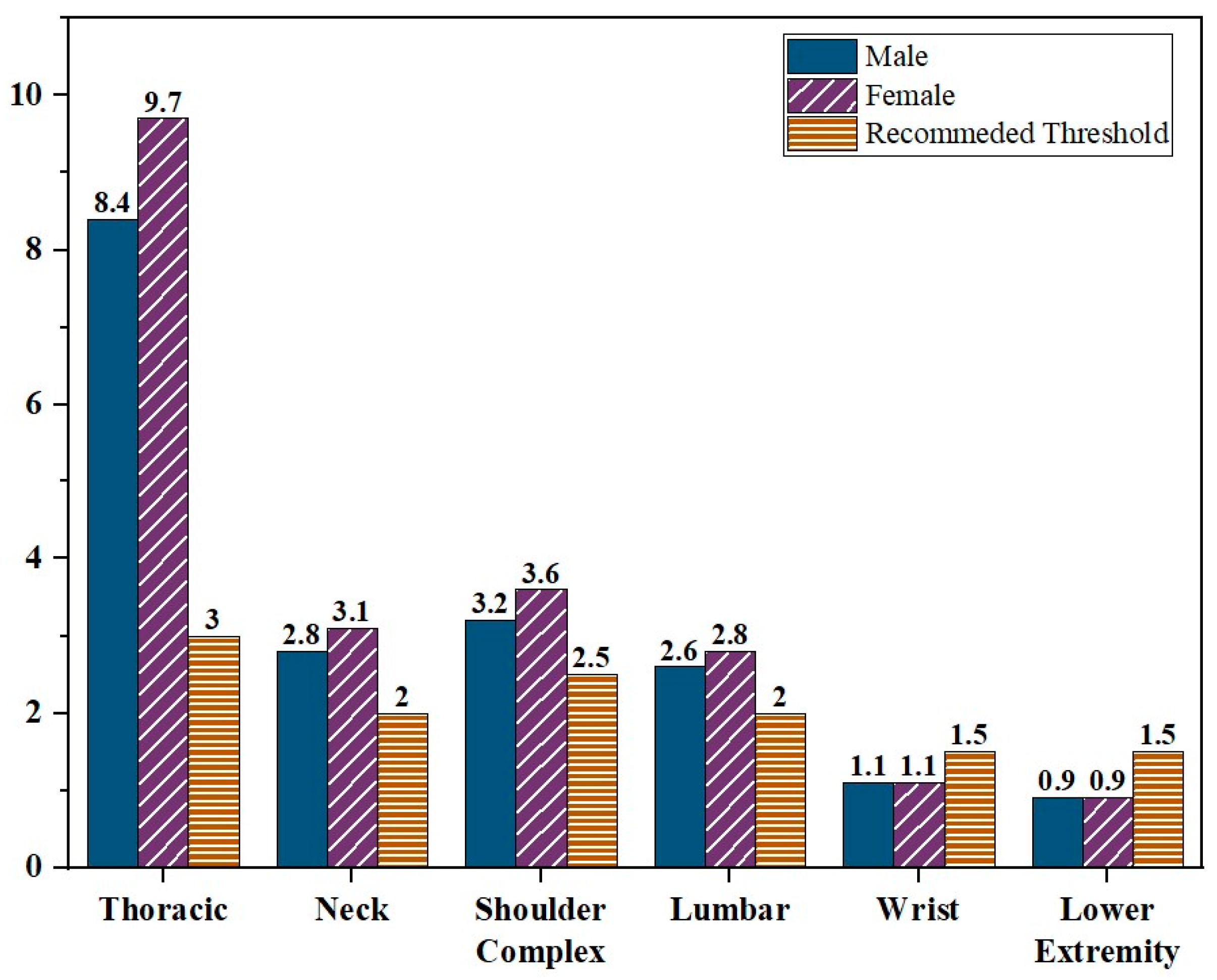 43]. These quantitative insights revealed critical risk levels in the thoracic and cervical regions, underscoring the limitations of standard office-centric ergonomic guidelines when applied in construction field conditions.