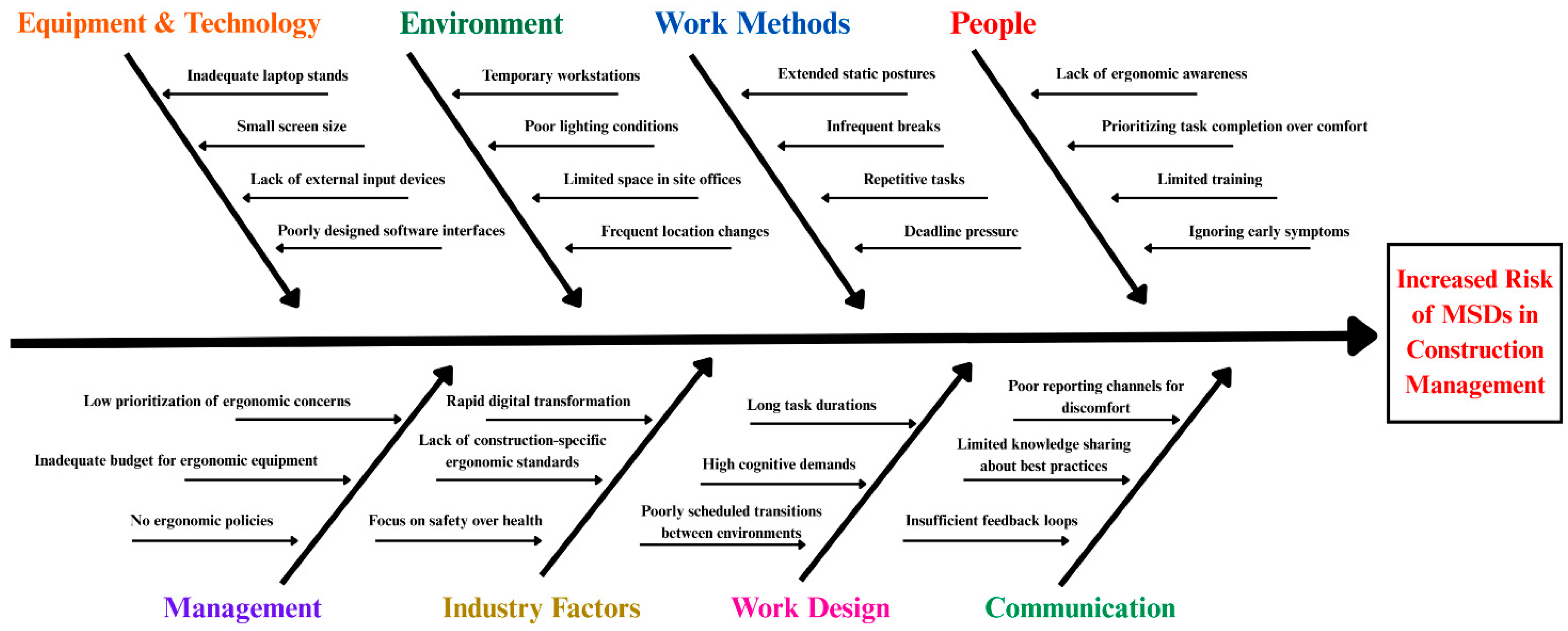 The scope of ergonomic challenges in digital construction management extends across various professional roles and contexts, with evidence showing that job demands and workplace stress among construction managers are associated with increased prevalence of musculoskeletal disorders [