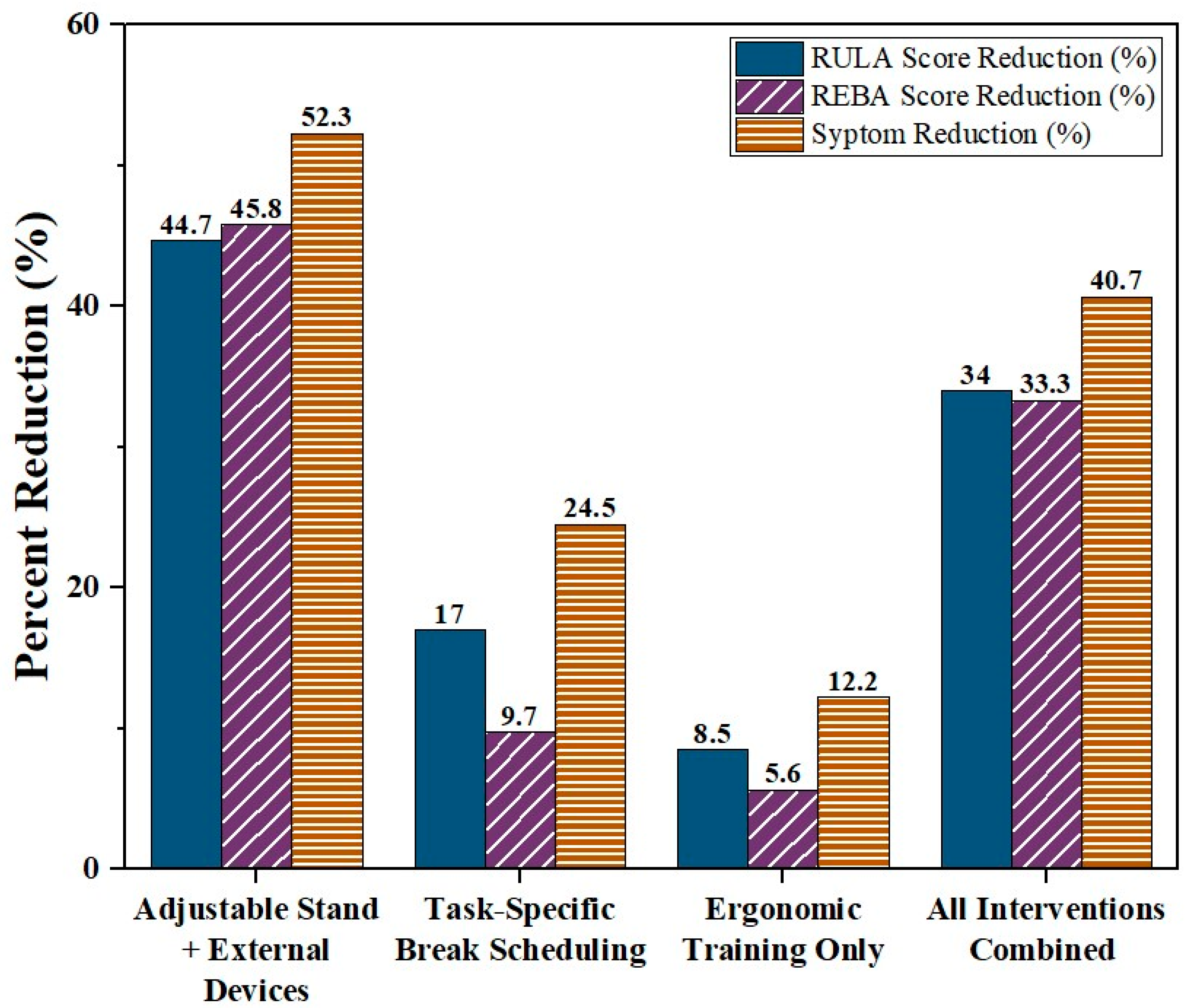 The ergonomic interventions implemented, particularly the use of adjustable laptop stands and external input devices, demonstrated significant improvements in RULA and REBA scores, far outperforming standalone training modules. This pattern is in line with the findings from prior interventions in the construction sector where physical modifications produced more consistent risk reductions than educational strategies alone [