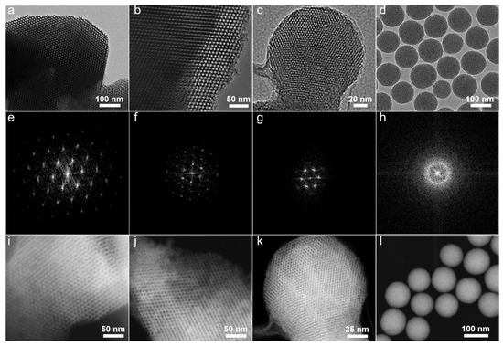 According to literature procedures, ~7 nm pore diameter SBA-15 [19], ~6 nm pore diameter KIT-6 [28], ~3 nm pore diameter mesoporous silica nanospheres (MSNSs) [32] and ~2 nm pore diameter MCM-41 mesoporous silica [28] were prepared. All samples were characterized with small-angle X-ray diffraction (XRD, Figure S1a), N2-sorption (Figure S1b,c) and high-resolution transmission electron microscopy (HRTEM). Properties obtained from small-angle XRD and N2 adsorption–desorption measurement are summarized in Table 1. Figure 1 shows HRTEM images of as-prepared SBA-15, KIT-6, MCM-41 and MSNSs. TEM images (Figure 1a–c) and corresponding fast Fourier transform (FFT) patterns (Figure 1e–g) reveal the hexagonally ordered mesoporous structure of SBA-15, KIT-6 and MCM-41. The image analysis gives the SBA-15 pore diameters as ~7.09 nm with wall thickness ~3.12 nm, KIT-6 pore diameters as ~6.87 nm and wall thickness ~2.21nm, and MCM-41 pore diameters as ~2.00 nm and wall thickness ~1.73 nm. Figure 1d,h suggest the as-prepared MSNS pore system did not show spatial translation symmetry.