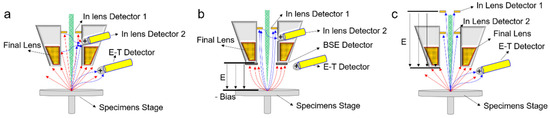 Schematic of the three kinds of low-voltage technologies. (a) Direct low voltage, (b) stage-bias beam deceleration (A reverse electric field is applied between the specimens stage and the pole piece), (c) in-column beam deceleration.