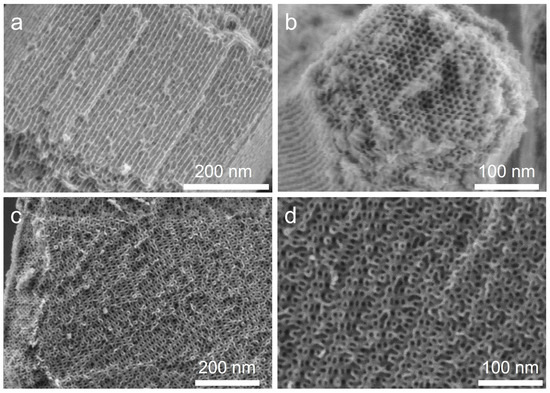 The invention of Mobil Composition of Matter No. 41 (MCM-41) [1] triggered an explosion of research into mesoporous materials, which have been intensively studied for applications as diverse as catalysis [2,3], molecular adsorption [4,5], drug delivery [6,7], molecular separation using membranes [8,9], energy [10] and templates for synthesis of advanced nanomaterials [11,12]. Transmission electron microscopy (TEM) was broadly used to characterize these ordered porous systems [13,14,15]. Different from TEM and scanning transmission electron microscopy (STEM) which have weak surface sensitivity, scanning electron microscopy (SEM) could reveal detailed information on more microscopic surface structures [16]. However, the practical spatial resolution of SEM was still limited by inclusion of delocalized secondary electron (SE) components [17], the charge effect and the instrument itself [18]. Low voltage coupled with an in-lens detector could control how the signals are dominated by the SE1 component that is emitted from a small escape depth under the specimen surface after direct excitation by the incident electron beam and could ease the charging on non-conducting materials. Terasaki et al. [19] first reported low-voltage scanning electron microscopy (LVSEM) direct observation of the 3D mesoporous structure of Santa Barbara No. 15 (SBA-15) with ~7.5 nm pore diameters and ~2.5 nm thickness of pore wall at 2 kV [20,21,22,23]. Bao et al. [24] imaged a series of SBA-15 materials with finely controlled pore length by using a classic cold field emission SEM instrument (Hitachi S4800, Hitachinaka, Japan) at 1.5 kV. However, the imaging performance of LVSEM in areas like resolution and contrast could be improved by using beam deceleration technology [16], which may further reduce interaction volume of incident electrons and specimens. Jóźwik et al. used an ultra-low-voltage (0.5 keV) SEM to directly visualize the high resistance region caused by ion irradiation in GaN through the damage-induced voltage-change imaging contrast mechanism [25]. Zhang et al. systematically studied the LVSEM imaging mechanism of high-density carbon nanotube arrays on SiO2/Si substrates, and developed an effective method to separate the three contrasts of topology, material and charge to accurately evaluate the array density and polymer residue distribution [26]. Kitta successfully used ultra-low voltage (0.5 keV) SEM to clearly distinguish the distribution of lithiated/delithiated particles in Li-ion battery electrodes, revealing the decisive influence of particle surface conductivity on secondary electron yield [27].