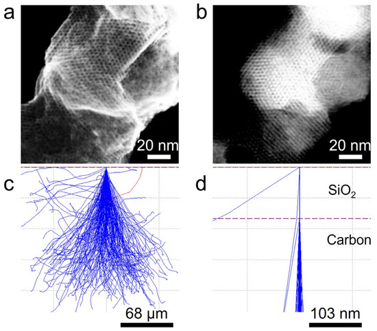 200 kV high-voltage SEM image of MCM-41. (a) A 200 kV secondary electron image of MCM-41, (b) HAADF-STEM simultaneous image of MCM-41, (c,d) Monte Carlo simulations of 2000 electrons with 200 keV kinetic energy are vertically incident to a 100 nm SiO2 membrane supported by carbon.
