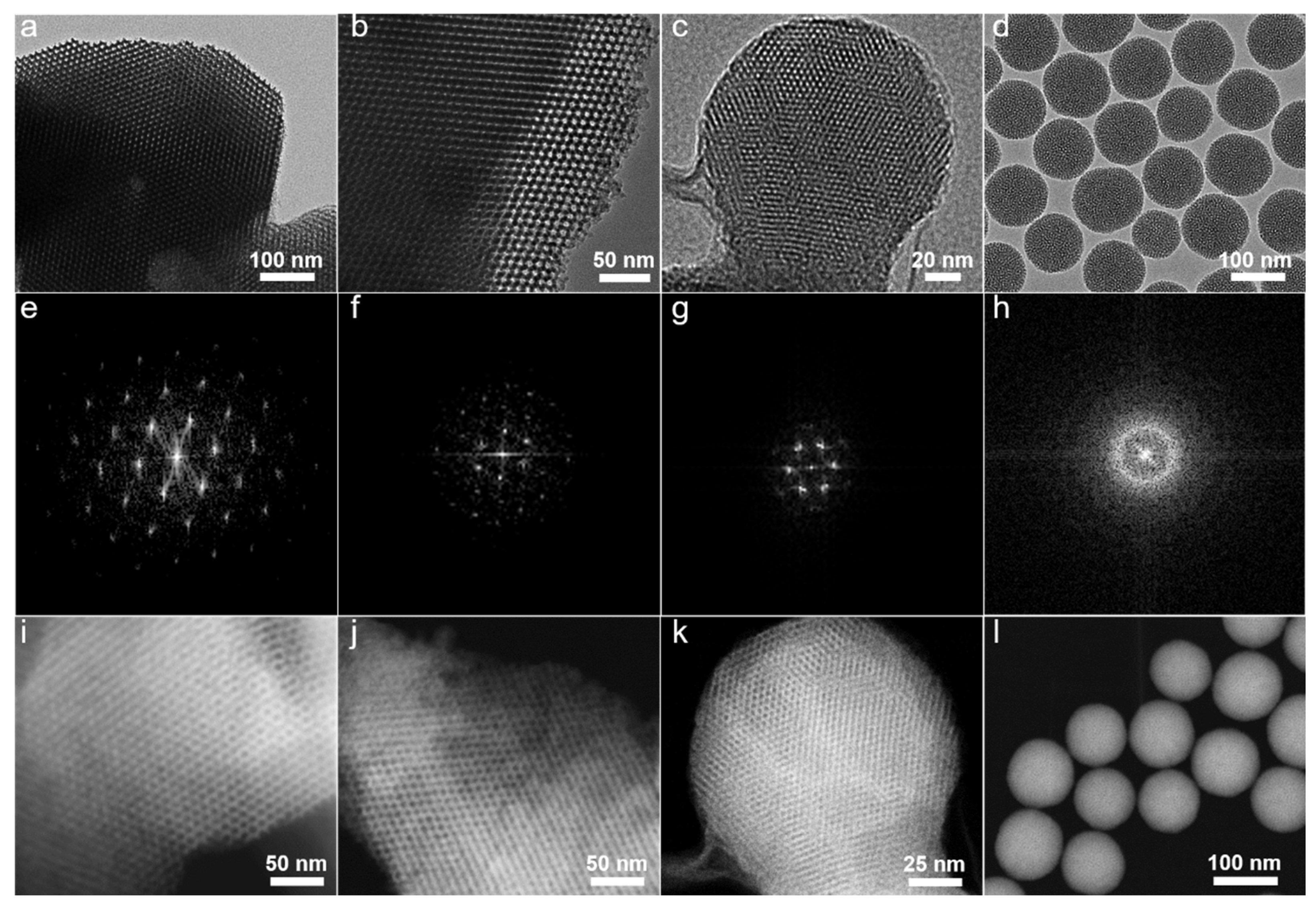 Figure 1. TEM characterization of as-prepared mesoporous silica. (ad) are TEM images of SBA-15, KIT-6, MCM-41 and MSNSs. (eh) Corresponding FFT patterns. (il) HAADF-STEM images of SBA-15, KIT-6, MCM-41 and MSNSs.