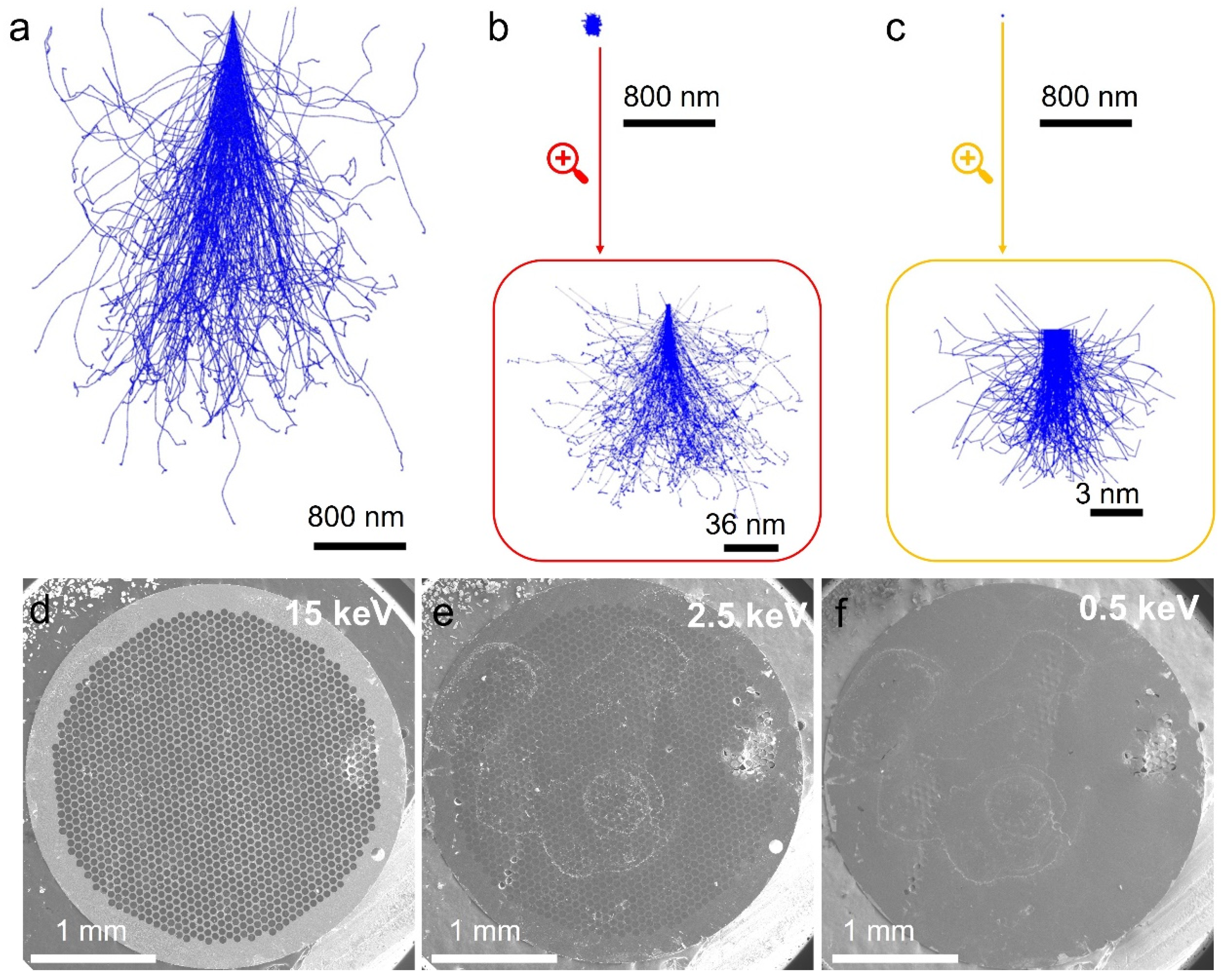 Figure 2. Dependence of surface details on accelerating voltage. (ac) Monte Carlo simulations of 2000 electrons with 15 keV, 2.5 keV and 500 eV kinetic energy are vertically incident to carbon. (df) SEM images of a TEM copper grids with accelerating voltage of 15 kV, 2.5 kV and 500 V.