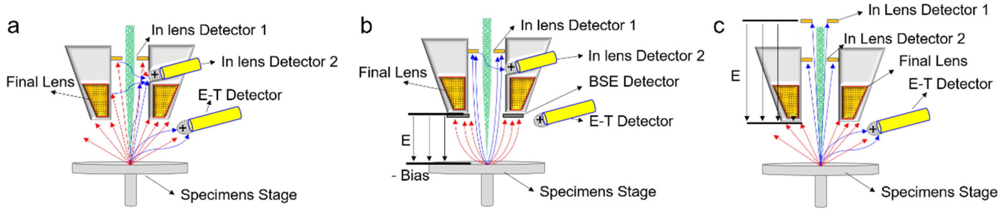 17. Zhang, X.; Cen, X.; Ravichandran, R.; Hughes, L.; Benthem, K. Simultaneous scanning electron microscope imaging of topographical and chemical contrast using in-lens, in-column, and everhart-thornley detector systems. Microsc. Microanal. 2016, 22, 565–575. [Google Scholar] [CrossRef]
