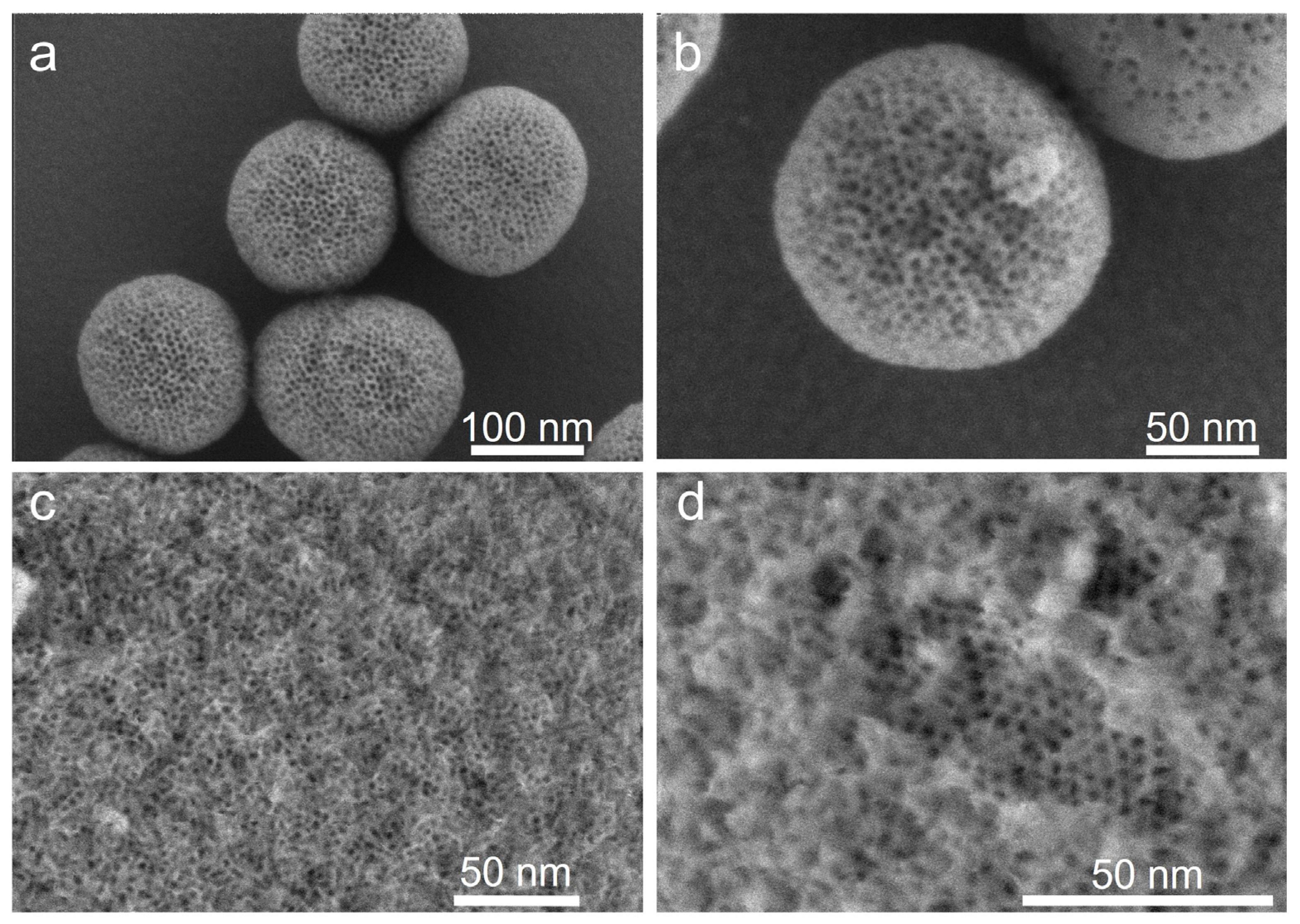 Figure 5. LVSEM images of MSNSs and MCM-41. MSNSs by concentric annular in-lens detector coupled with 8 kV in-column beam deceleration, (a,b), MCM-41 (c,d) by integrating a concentric annular in-lens detector and side position in-lens detector with −3.5 kV stage bias; landing energy = 500 eV.