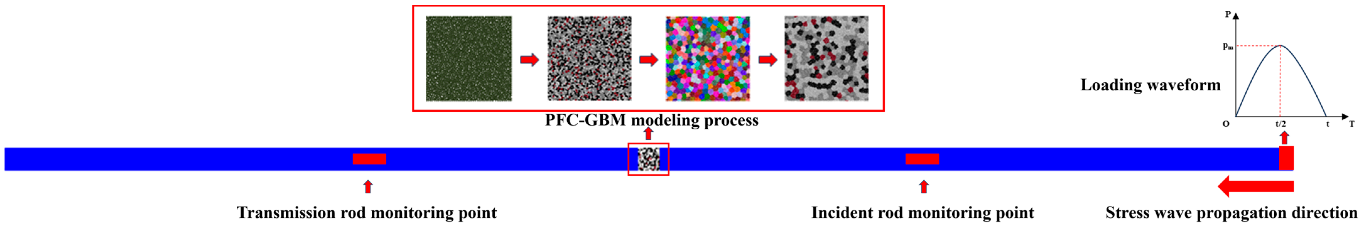 - Li, W.; Shi, C.; Zhang, C. Numerical Study on the Effect of Grain Size on Rock Dynamic Tensile Properties Using PFC-GBM. Comput. Part. Mech. 2024, 11, 481–489. [Google Scholar] [CrossRef]