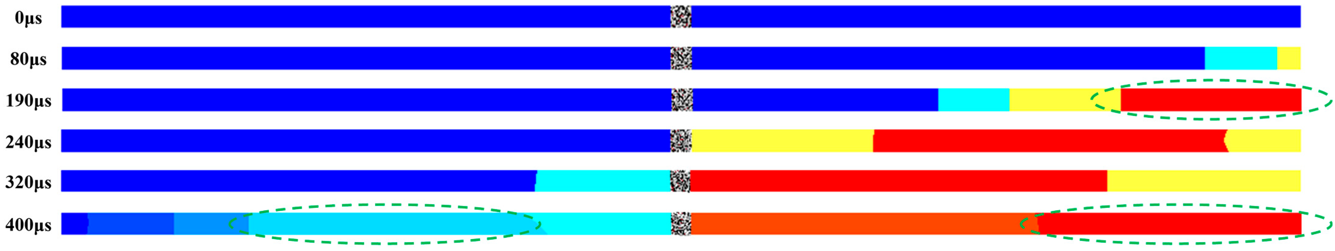 - An axisymmetric elastic rod is generated in FLAC, with both the incident and transmission rods having a length of 1.8 m, a diameter of 50 mm, a density of 7.89 g/cm3, an elastic modulus of 220 GPa, and a Poisson’s ratio of 0.21.