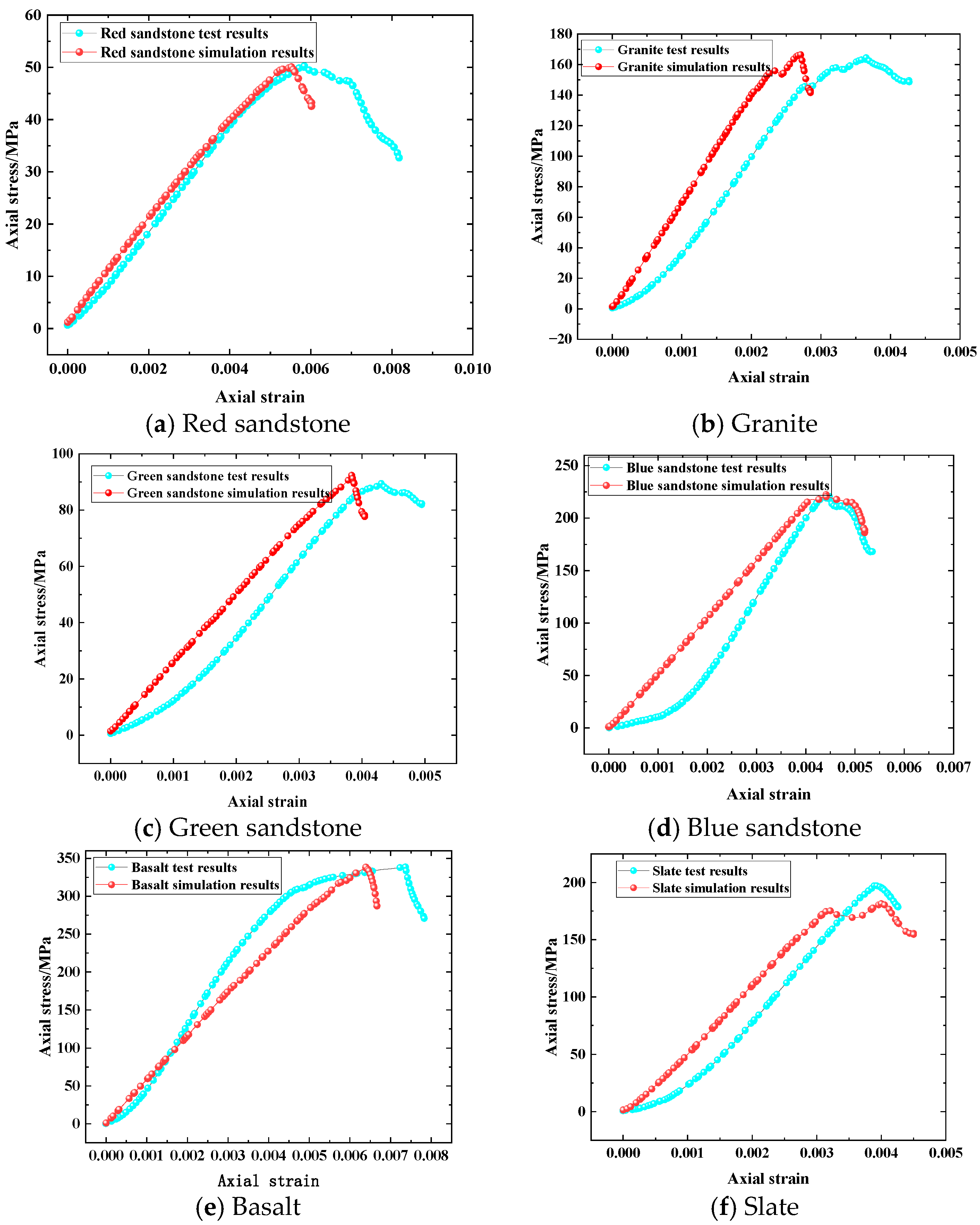 - Zhu, W.; Wang, F.; Mu, J.; Yin, D.; Lu, L.; Chen, Z. Numerical Simulation of Strength and Failure Analysis of Heterogeneous Sandstone under Different Loading Rates. Sci. Rep. 2023, 13, 22722. [Google Scholar] [CrossRef]