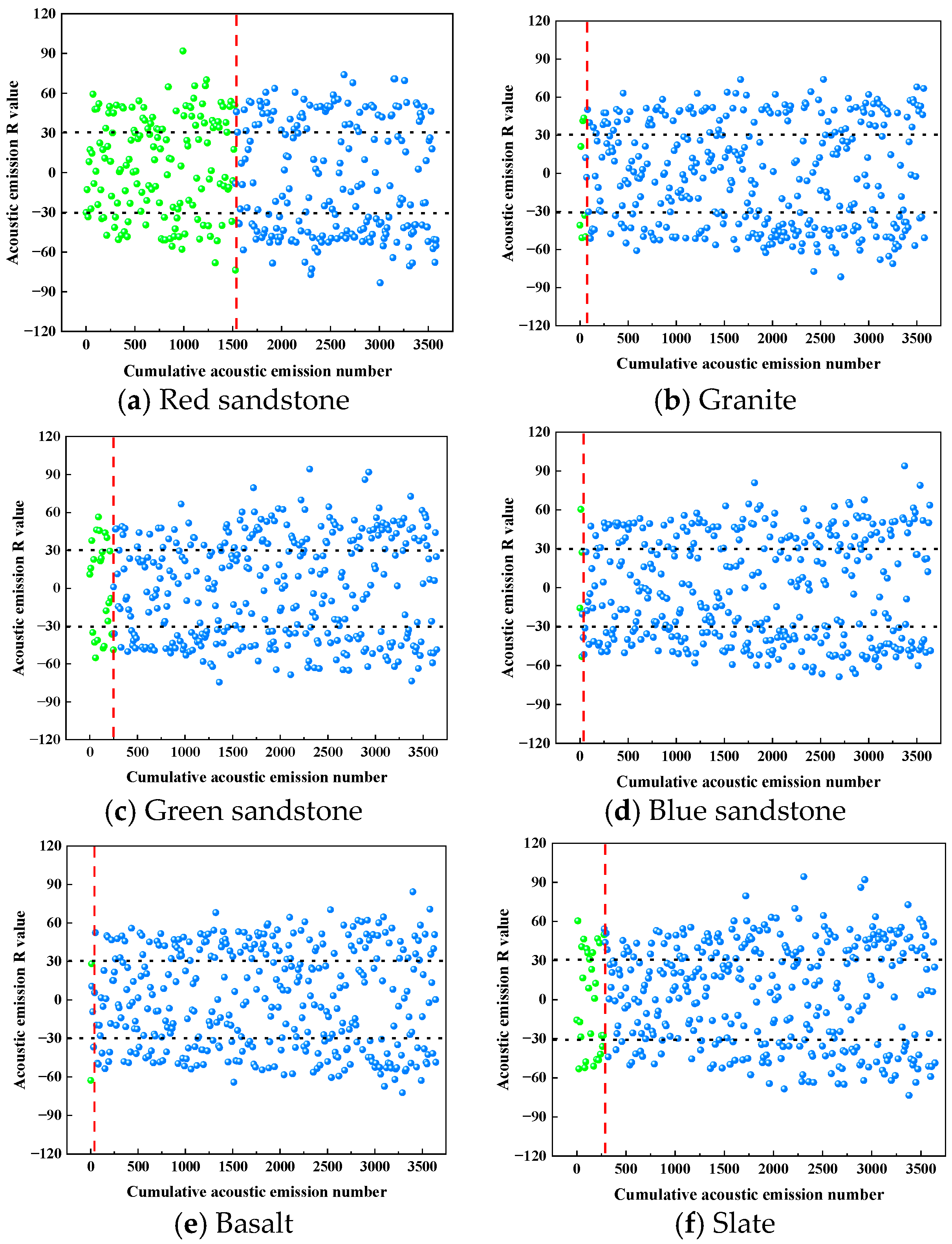 4.1.1. Characteristics of Acoustic Emission R-Value and Distribution of Focal Types