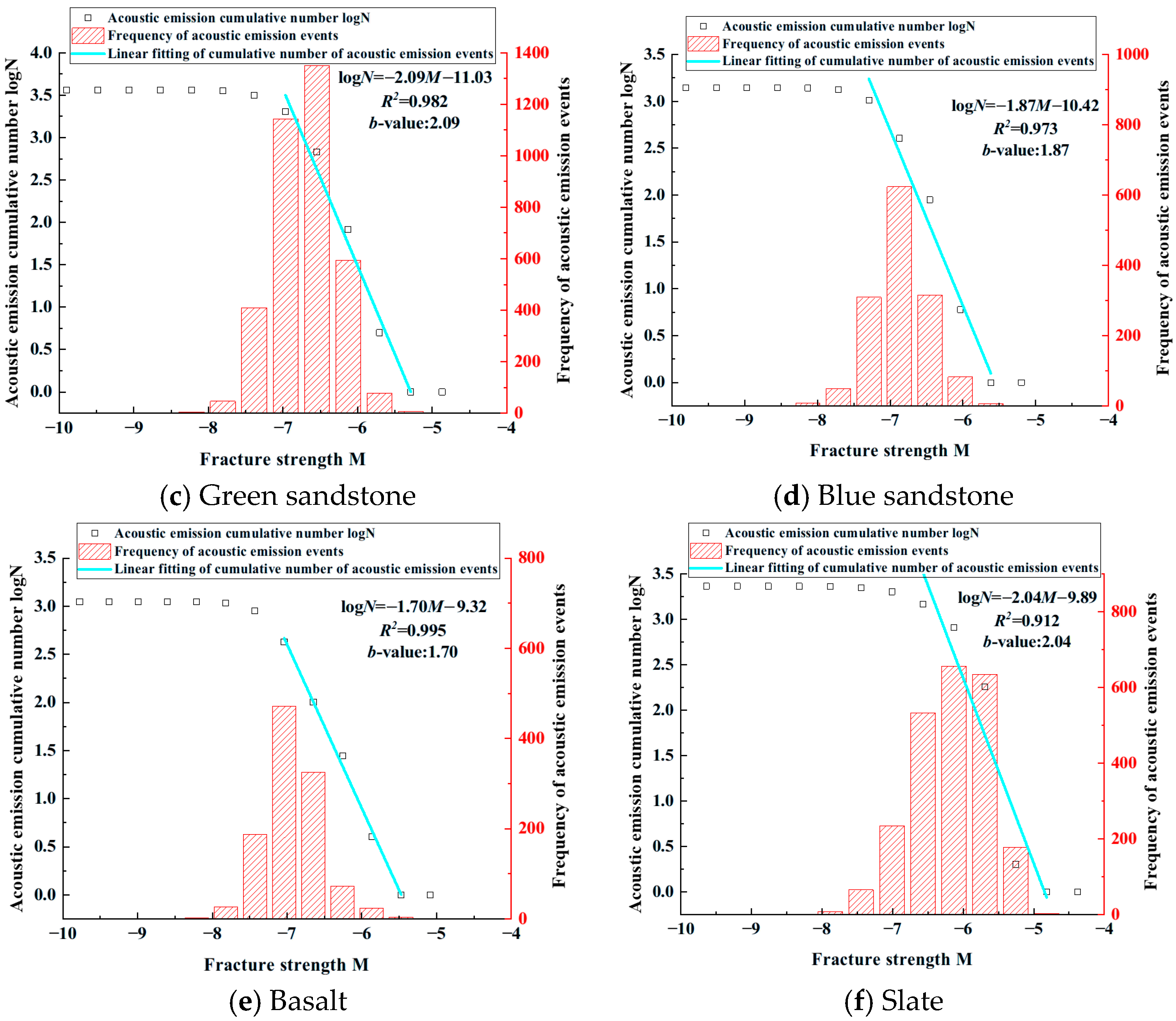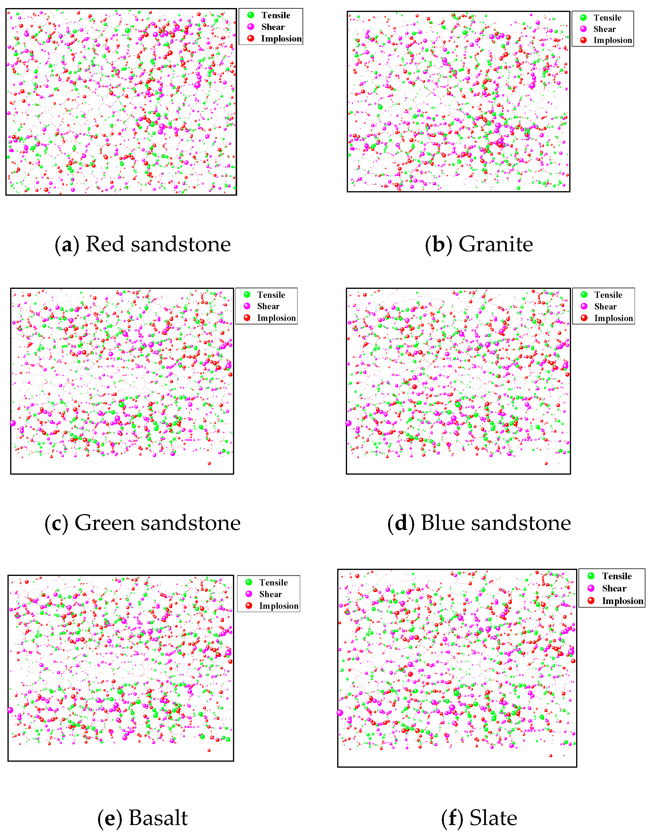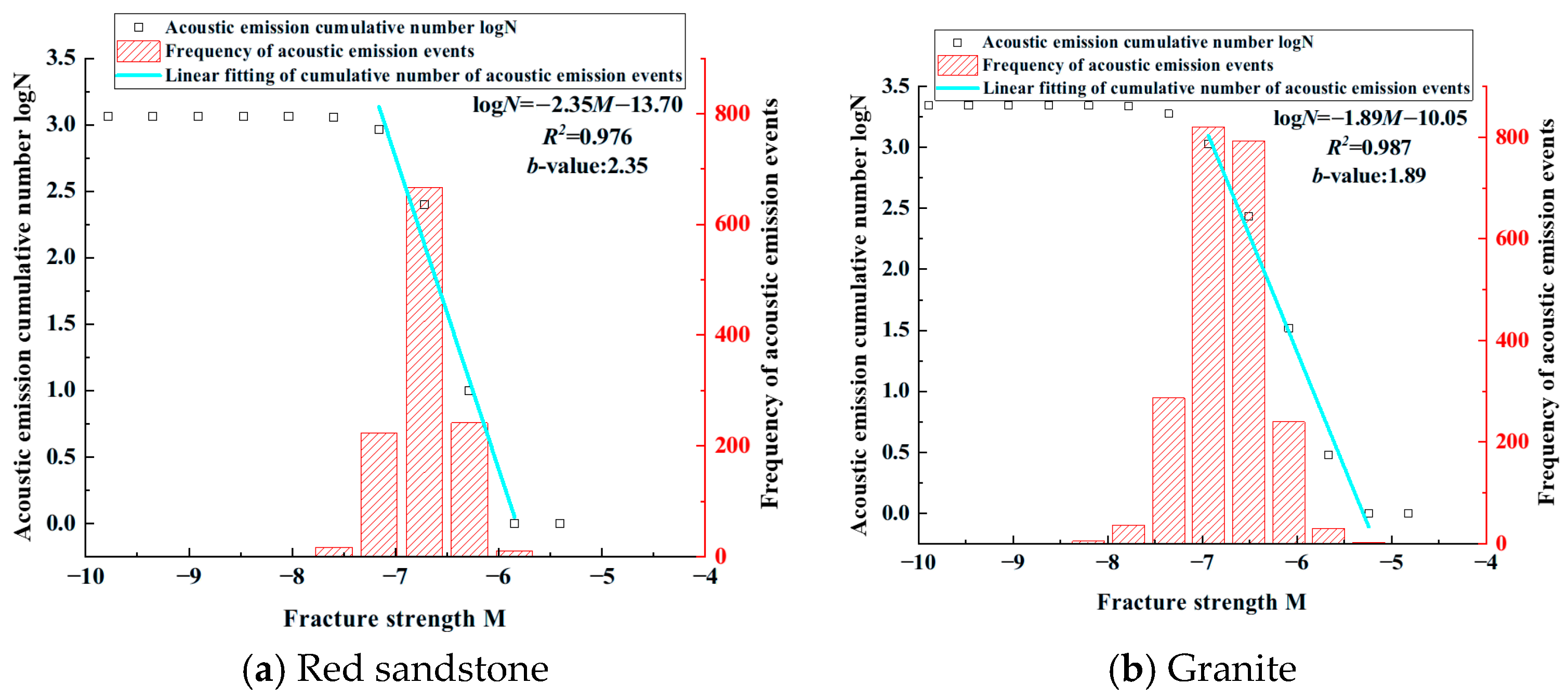 - Bu, F.; Xue, L.; Zhai, M.; Huang, X.; Dong, J.; Liang, N.; Xu, C. Evaluation of the Characterization of Acoustic Emission of Brittle Rocks from the Experiment to Numerical Simulation. Sci. Rep. 2022, 12, 498. [Google Scholar] [CrossRef] [PubMed]