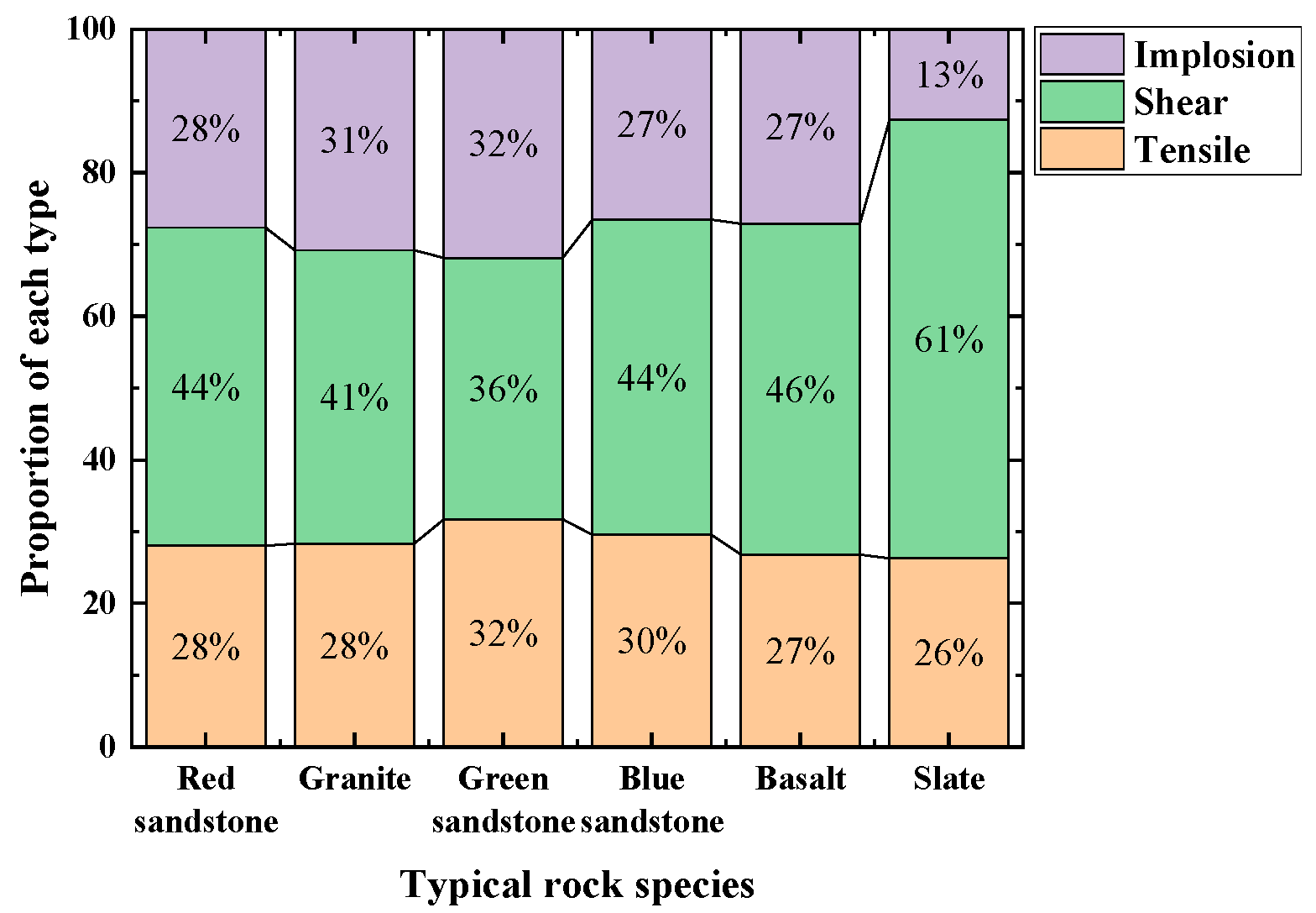 - During impact loading, seismic sources associated with lithologies exhibit a greater density at the boundaries, demonstrating a pattern of aggregation from the boundary into the interior of the sample. The observed distribution features are almost intricate, mainly characterized by shear–tension–implosion interactions, with point clouds predominantly located at grain–grain interfaces. This reflects the critical roles of stress concentration and interface weakening in facilitating impact failure. Notably, the proportion of shear-type sources ranges between 36% and 61%, indicating that tensile cracking is the predominant mode of rock failure.