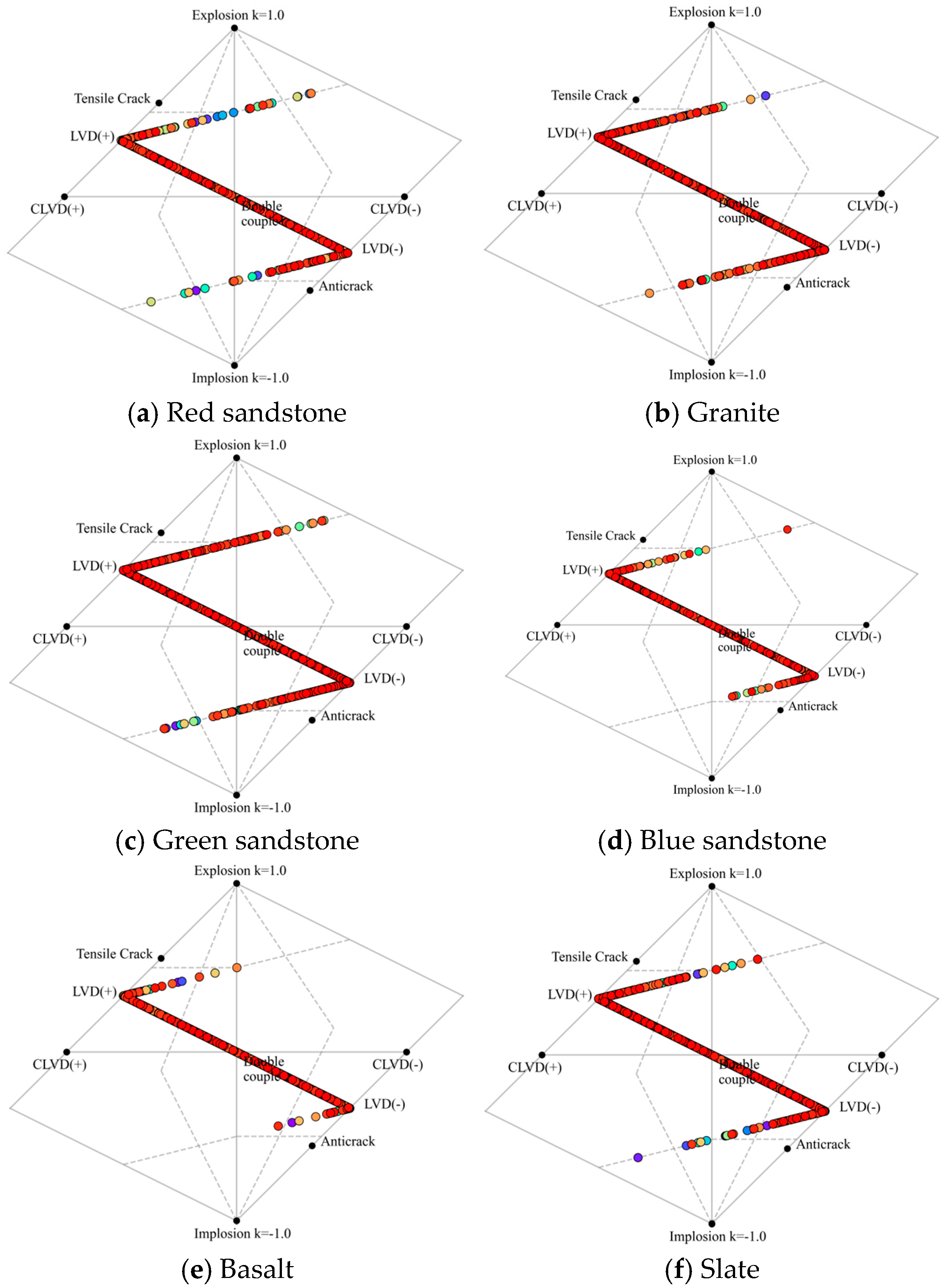 - Hudson, J.A.; Pearce, R.G.; Rogers, R.M. Source Type Plot for Inversion of the Moment Tensor. J. Geophys. Res. Solid Earth 1989, 94, 765–774. [Google Scholar] [CrossRef]