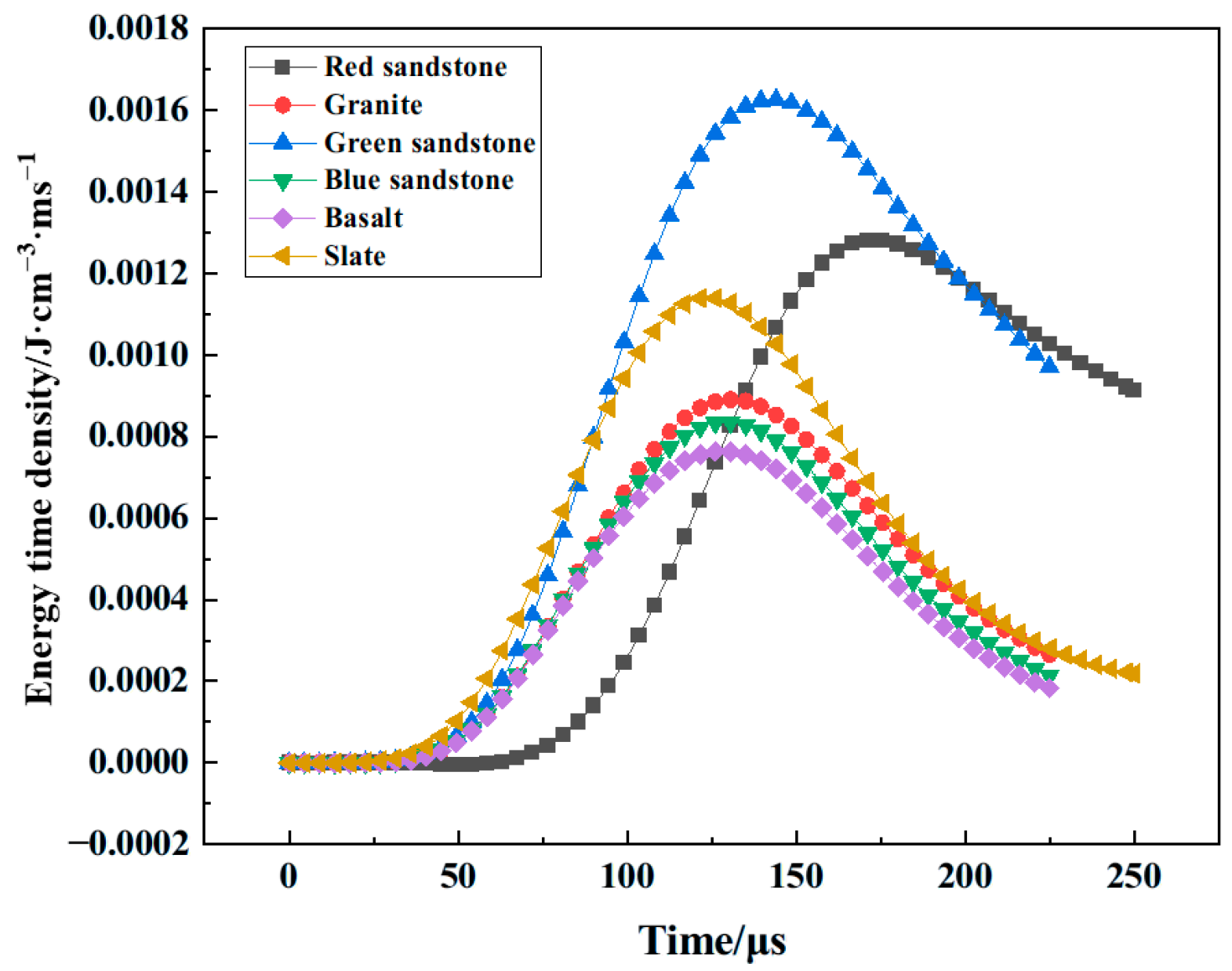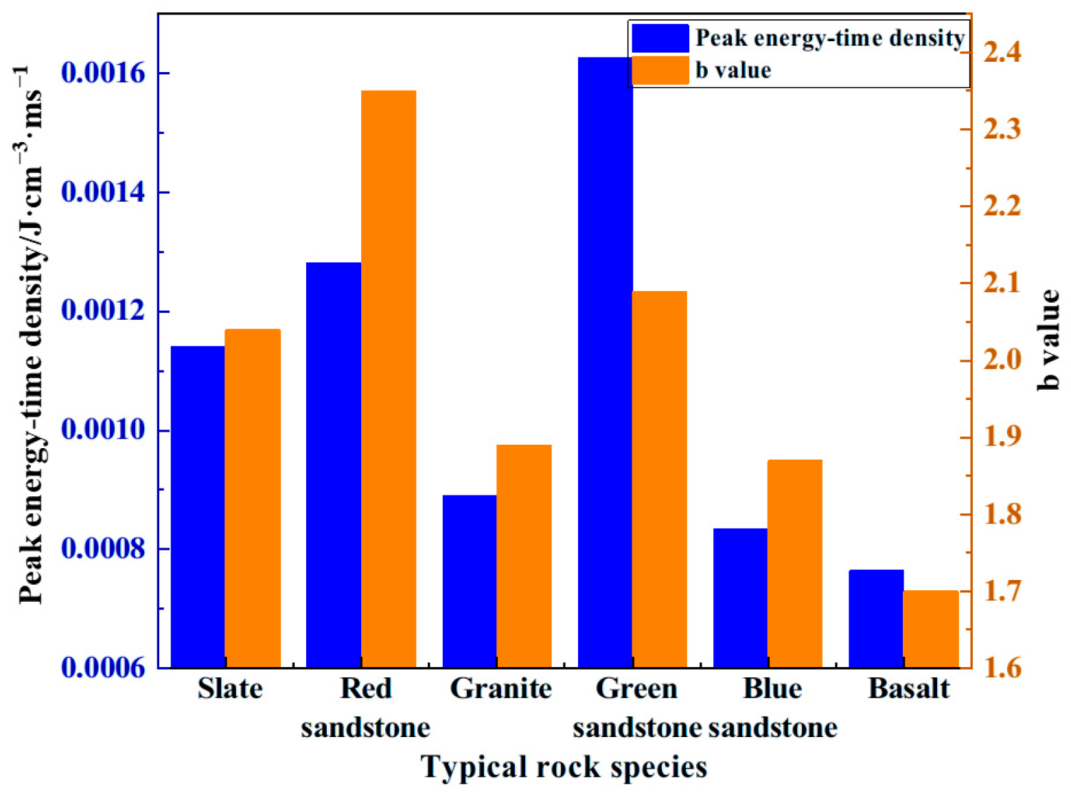- The time–density plots of all rock types almost reveal a steady trend of initially increasing, followed by a subsequent decrease. There exists a correlation between the peak value of energy–time density and the B-value. Rocks characterized by high energy dissipation capacity predominantly display small-amplitude AE events and small-scale fractures, whereas rocks with lower dissipation capacity are primarily associated with large-amplitude AE events and substantial fractures.