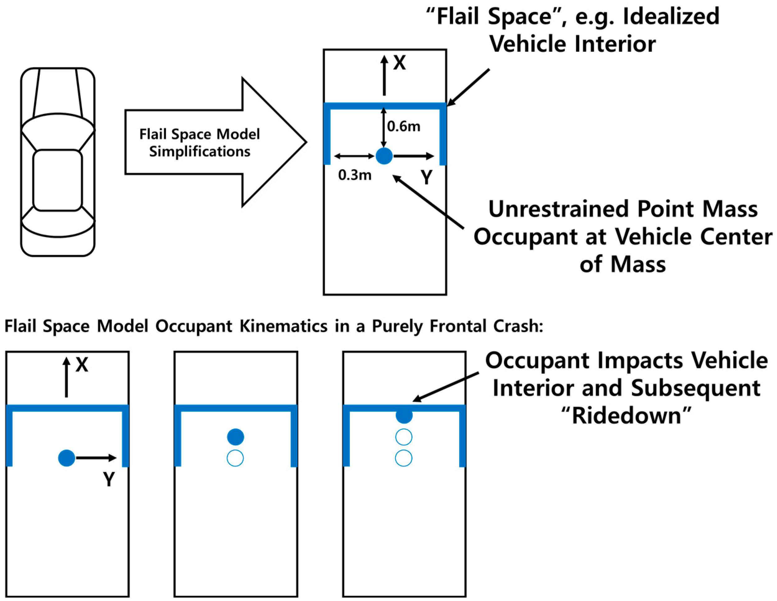 - Distances that the occupant is allowed to “flail” prior to impacting the vehicle interior are assumed to be 0.6 m (2 feet) longitudinally (i.e., parallel with the typical vehicle travel direction) and 0.3 m (1 foot) in the lateral direction.