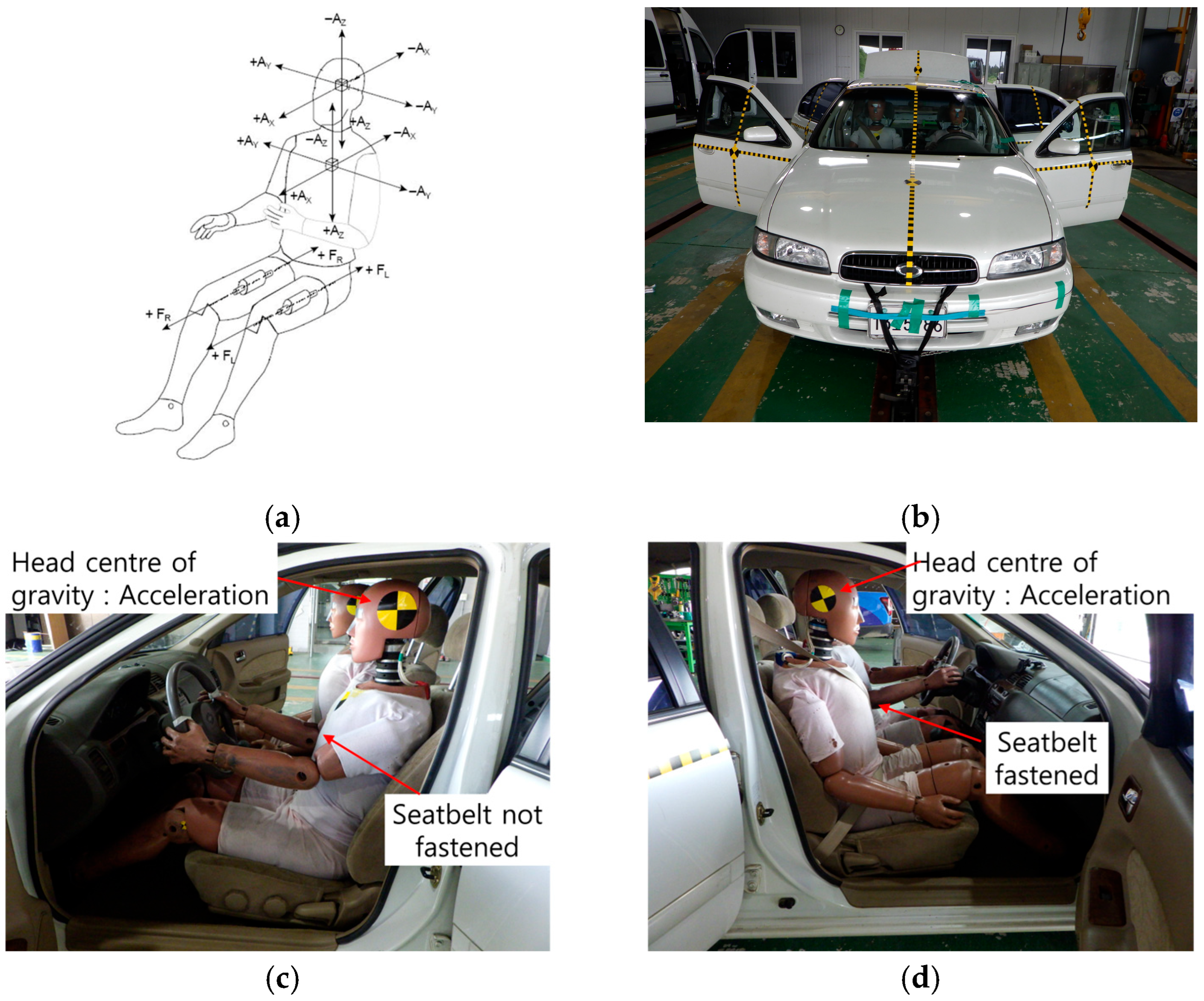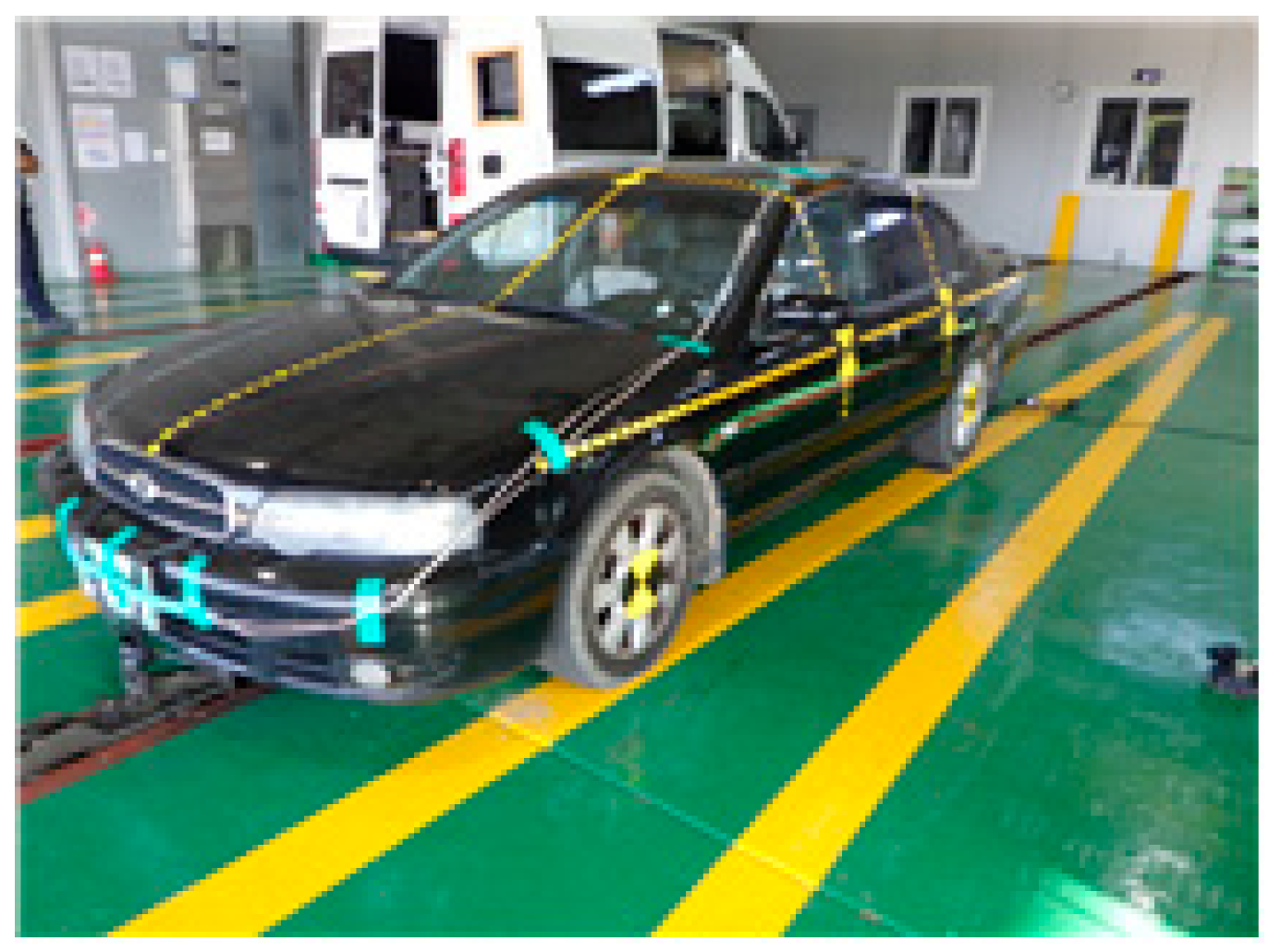 - Korea Transportation Safety Authority, Korea Automobile Testing & Research Institute. 2012 New Car Assessment Program (NCAP) Research Report; Korea Transportation Safety Authority: Hwaseong, Republic of Korea, 2012. [Google Scholar]
