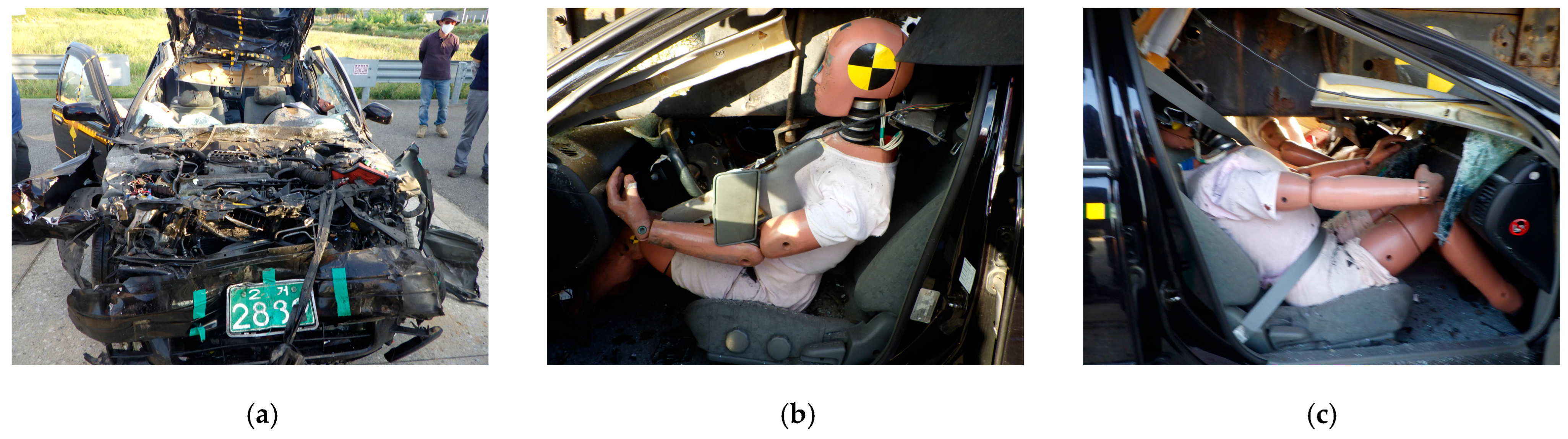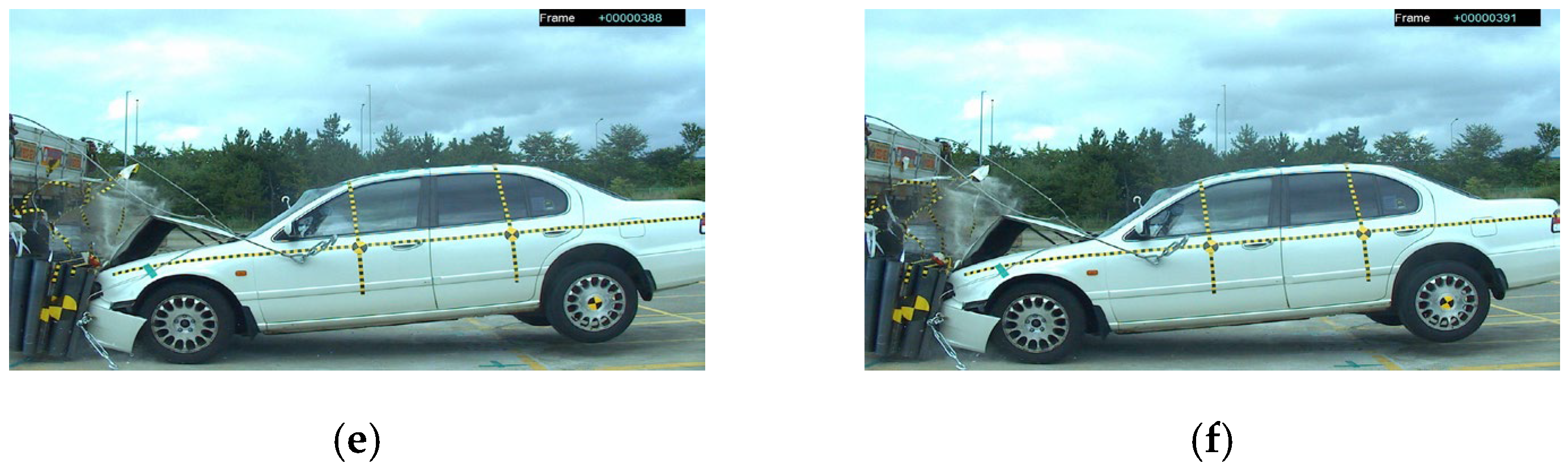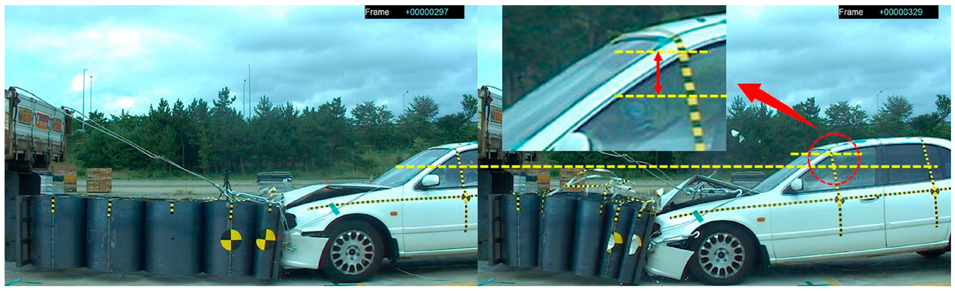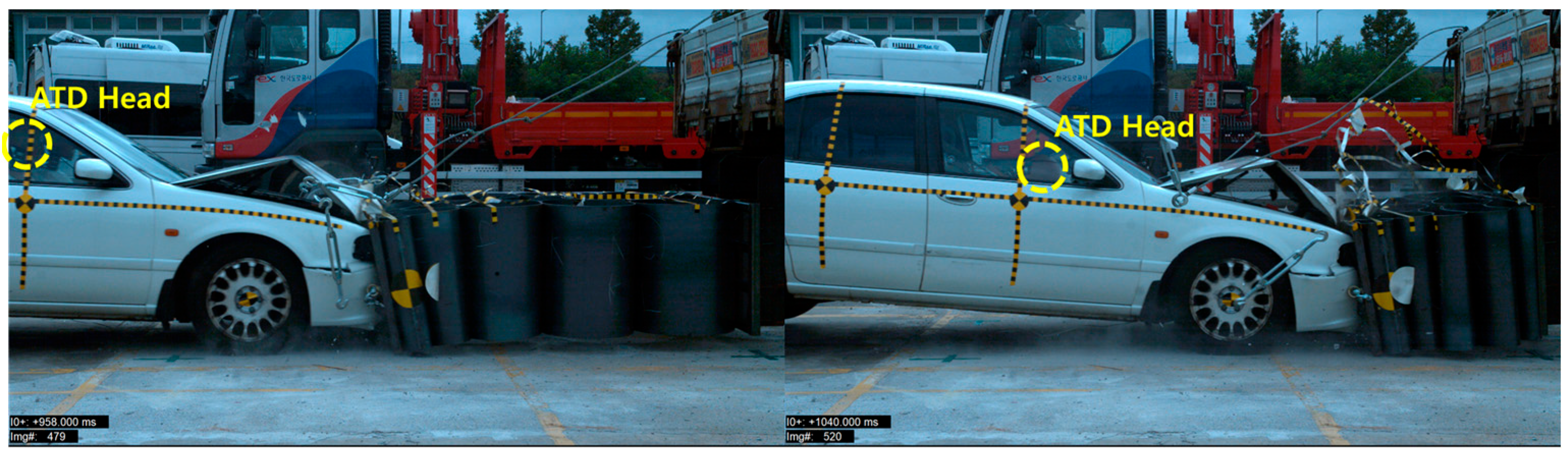 - Korea Transportation Safety Authority, Vehicle Performance Test Research Center. Research Report on Crash Tests for New Car Assessment; Korea Transportation Safety Authority: Anyang, Republic of Korea, 2000. [Google Scholar]