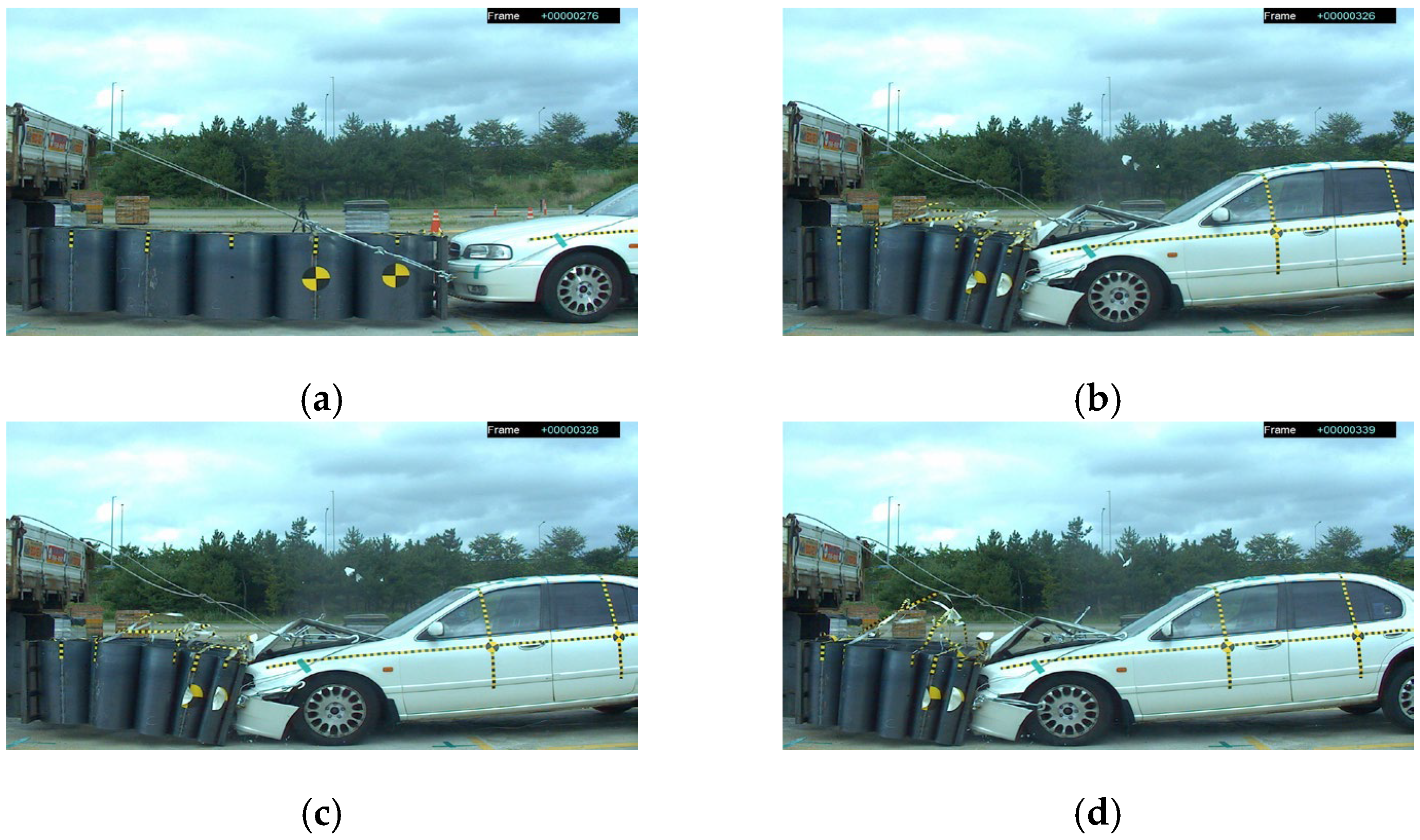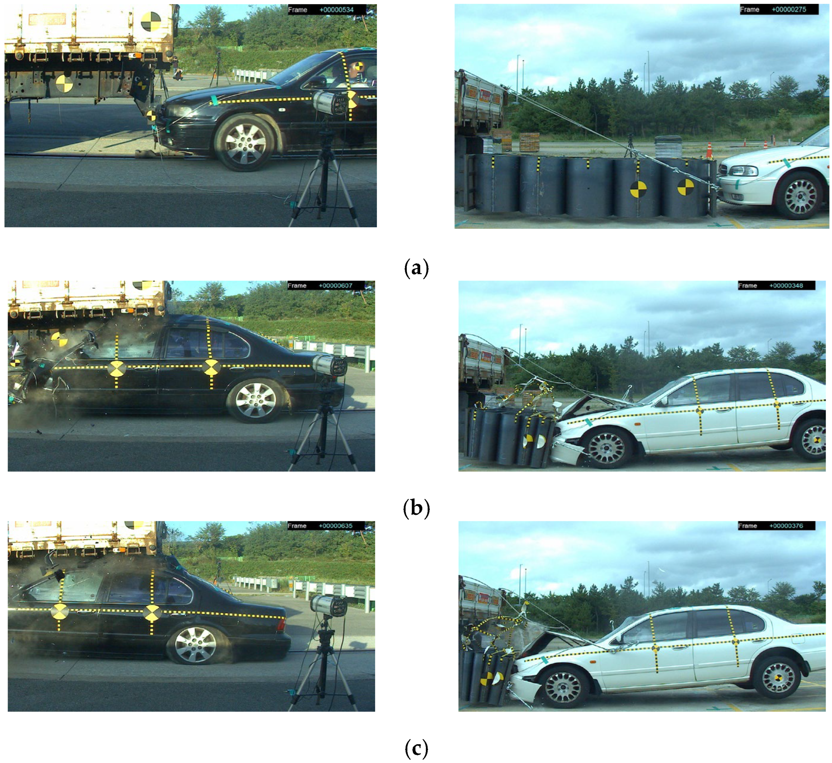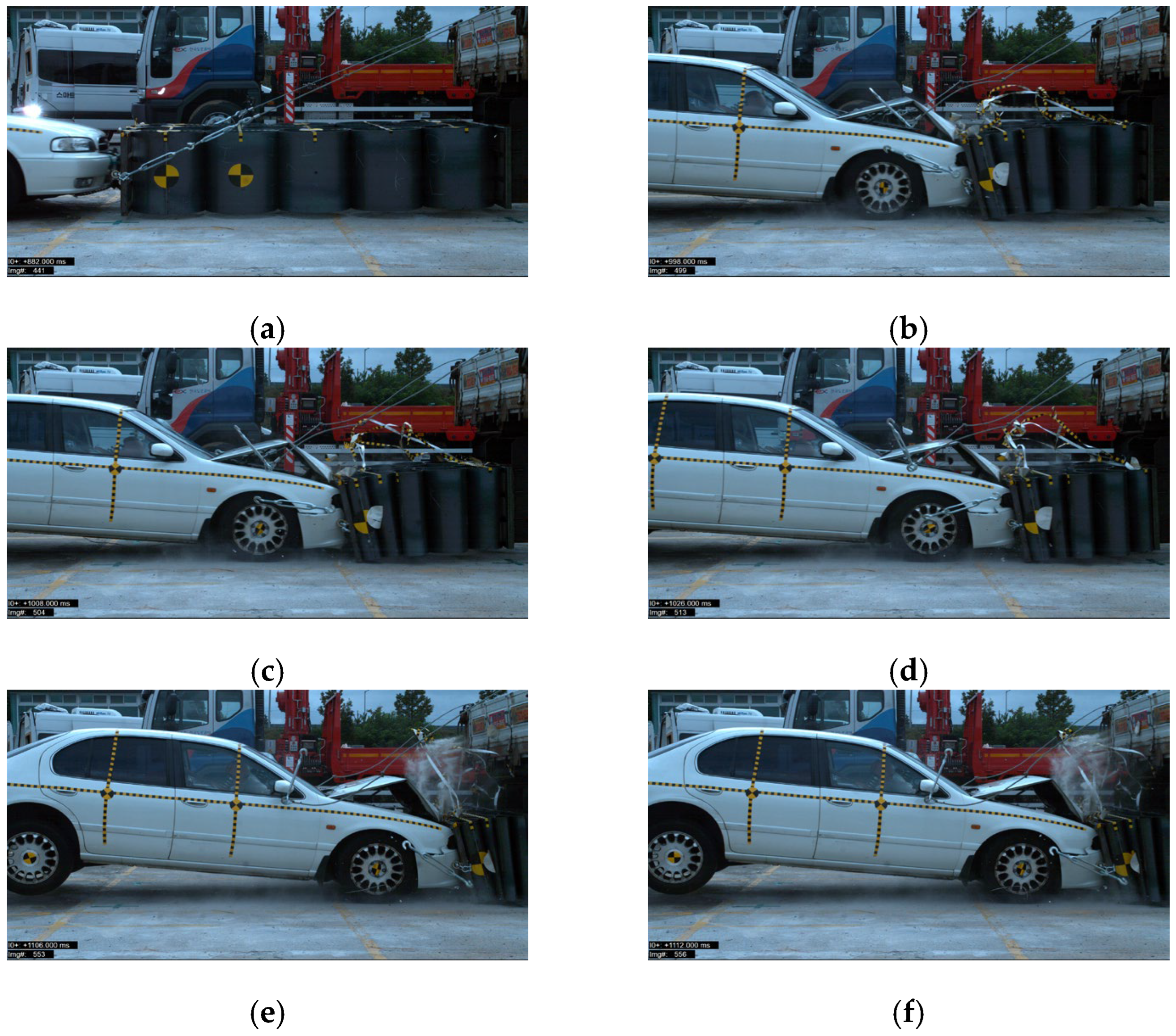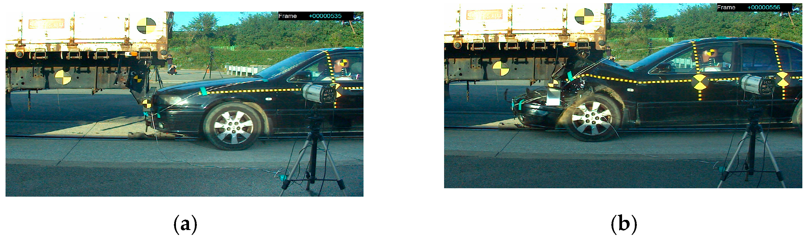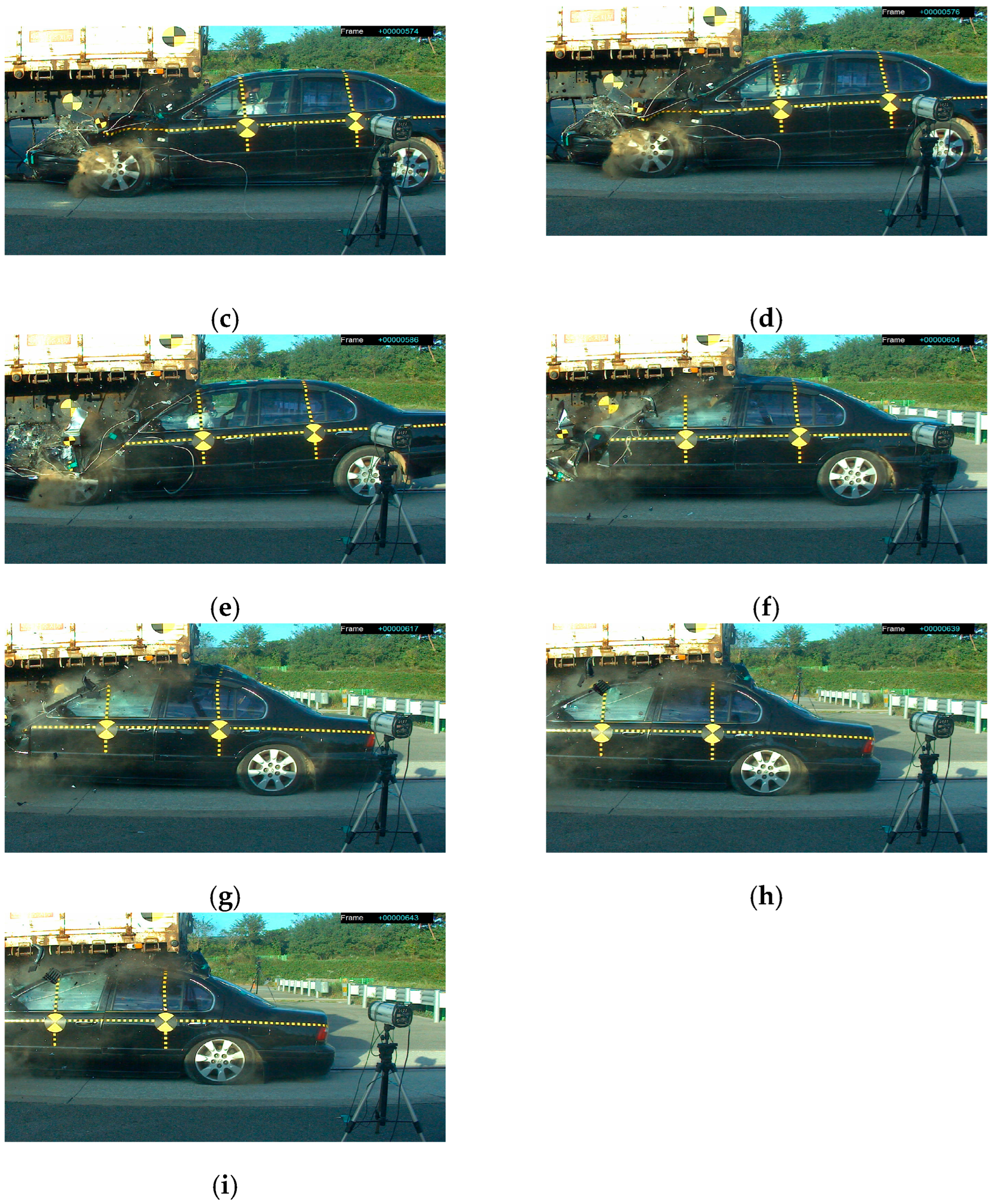 - Korea Transportation Safety Authority, Vehicle Performance Test Research Center. Research Report on Crash Tests for New Car Assessment; Korea Transportation Safety Authority: Anyang, Republic of Korea, 2000. [Google Scholar]