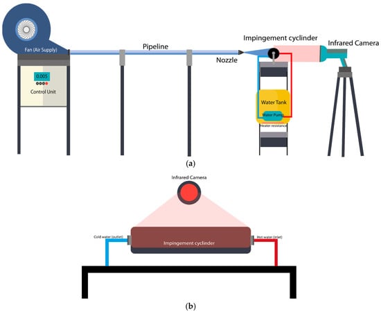 The schematic representation and physical layout of the experimental system are illustrated in Figure 1a,b. The experimental setup consists of a controlled air delivery system and a thermally regulated rotating cylinder designed to simulate jet impingement scenarios under laboratory conditions. A centrifugal blower supplies airflow through a PVC pipeline system, directing it toward interchangeable nozzles mounted at a fixed height from the cylinder surface. The airflow path is designed with a length of 50 hydraulic diameters (Lh = 400 mm) between the blower and nozzle inlet to ensure fully developed flow conditions. Lightweight plastic piping is selected to minimize frictional loss and mechanical load.