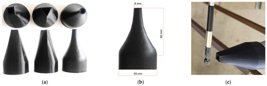 Three nozzle types—circular, square, and triangular—are designed to have identical hydraulic diameters (Dh = 0.008 m) to ensure comparable flow conditions at the exit plane. The nozzles are fabricated using Fused Deposition Modeling 3D printing technology, employing polylactic acid filament due to its ease of processing and structural rigidity. Wall thicknesses are minimized to reduce aerodynamic resistance and preserve flow symmetry. Front and top views of the fabricated nozzles are depicted in Figure 2a. As an example, the outer and inner diameters and the contraction length of the circular nozzle are given in Figure 2b. The position of the hot-wire anemometer and nozzle is given in Figure 2c.