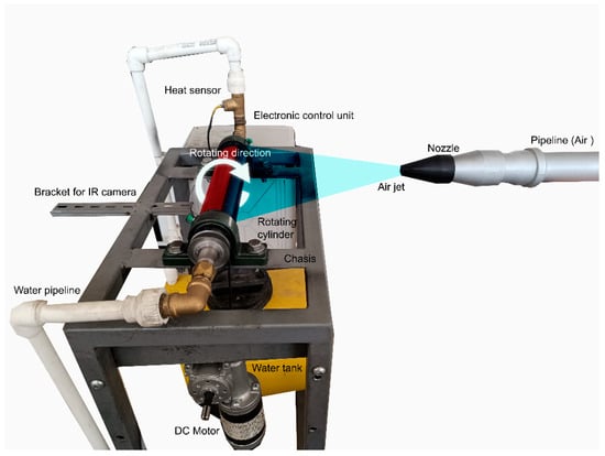The rotating cylinder is actuated by a step motor with integrated encoder feedback, connected to the cylinder through a belt–pulley system to ensure smooth and vibration-free operation. Figure 3 shows the motion control system and cylinder. The rotational speed is adjustable between 0 and 100 RPM through a digital interface, allowing for systematic investigation of rotational effects on impingement heat transfer. Limit switches are installed along the x-axis to restrict motion range and ensure safe mechanical operation. The motor is programmed using pre-calibrated step counts to maintain rotational accuracy.