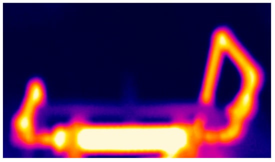 Case 1 represents the configuration in which all parameters take their lowest levels (A = 1, B = 1, C = 1, D = 1, E = 1,). In this case, the Reynolds number is Re = 2000, corresponding to a laminar flow regime. The speed of the rotating cylinder Urc is 20 rpm. The dimensionless nozzle-to-cylinder distance is H/Dh = 3. A circular nozzle geometry with constant temperature Ts = 45 °C is employed in this setup. The thermal camera images obtained under these conditions are presented in Figure 5. Case 16 is shown in Figure 6 where the Re number is 7000, H/Dh is 3, Urc is 60 rpm, a square nozzle is used, and Ts is 70 °C.