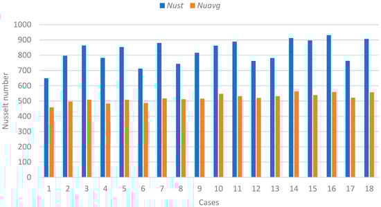 The average Nusselt number (Nuavg) under steady-state conditions was obtained by averaging the local Nu values across the impinged surface after the system had reached thermal equilibrium. The analysis revealed that the lowest stagnation and Nusselt numbers are obtained in Cases 1, 2, and 3, whereas the highest values are recorded in Cases 16, 17, and 18. This pronounced variation can be primarily attributed to the influence of the Re, which directly governs the flow regime and convective heat transfer intensity. For the jets, the stagnation scaling is typically Nust ∝ Rem between about 0.5 and 0.8 (exact exponent depends on nozzle-to-surface distance, jet turbulence, confinement, etc. [14]). Specifically, the Re number was 2000 in the lowest-performing cases and 7000 in the highest, demonstrating a strong positive correlation between flow turbulence and heat transfer enhancement.