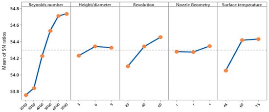 The Taguchi-based optimization demonstrates that the combination of parameters yielding the highest S/N ratio corresponds to the condition with the maximum Reynolds number (7000), H/Dh = 6, Ucr = 40 rpm, moderate nozzle geometry, and Ts = 75 °C. Under these conditions, the average Nusselt number is significantly improved compared to the baseline cases.