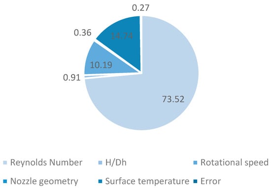 As a summary, the results show that the Reynolds number is the most dominant factor, accounting for 73.52% of the total variation, while surface temperature Ts (14.74%) and rotational speed Ucr (10.19%) follow as the next most influential parameters. Conversely, H/Dh (0.91%) and nozzle geometry (0.36%) show comparatively minor effects. The low residual error (0.27%) indicates a high level of experimental reliability and repeatability.