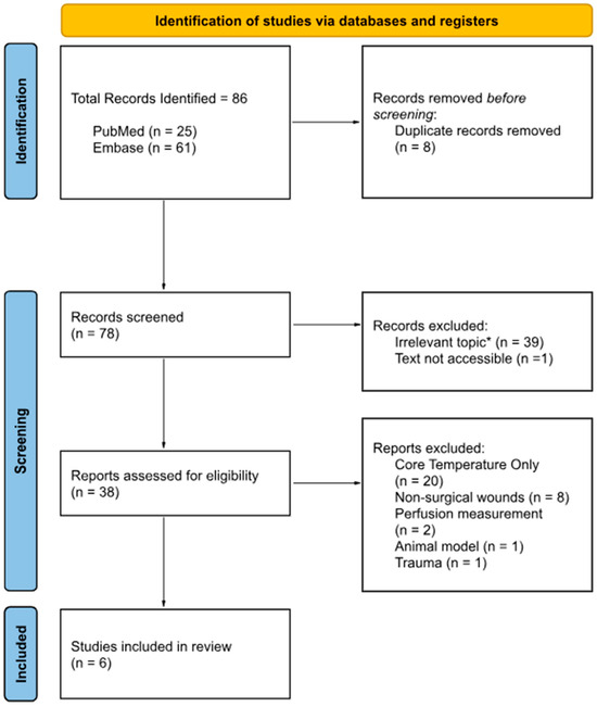 The initial database search identified 86 records: 25 from PubMed and 61 from Embase. After removal of 8 duplicate records, 78 unique citations remained for title and abstract screening. Of these, 39 records were excluded based on title and abstract review, primarily due to irrelevant topics, wrong patient population (chronic wounds), or the inability to access full-text article.