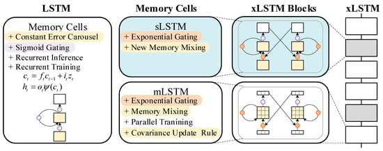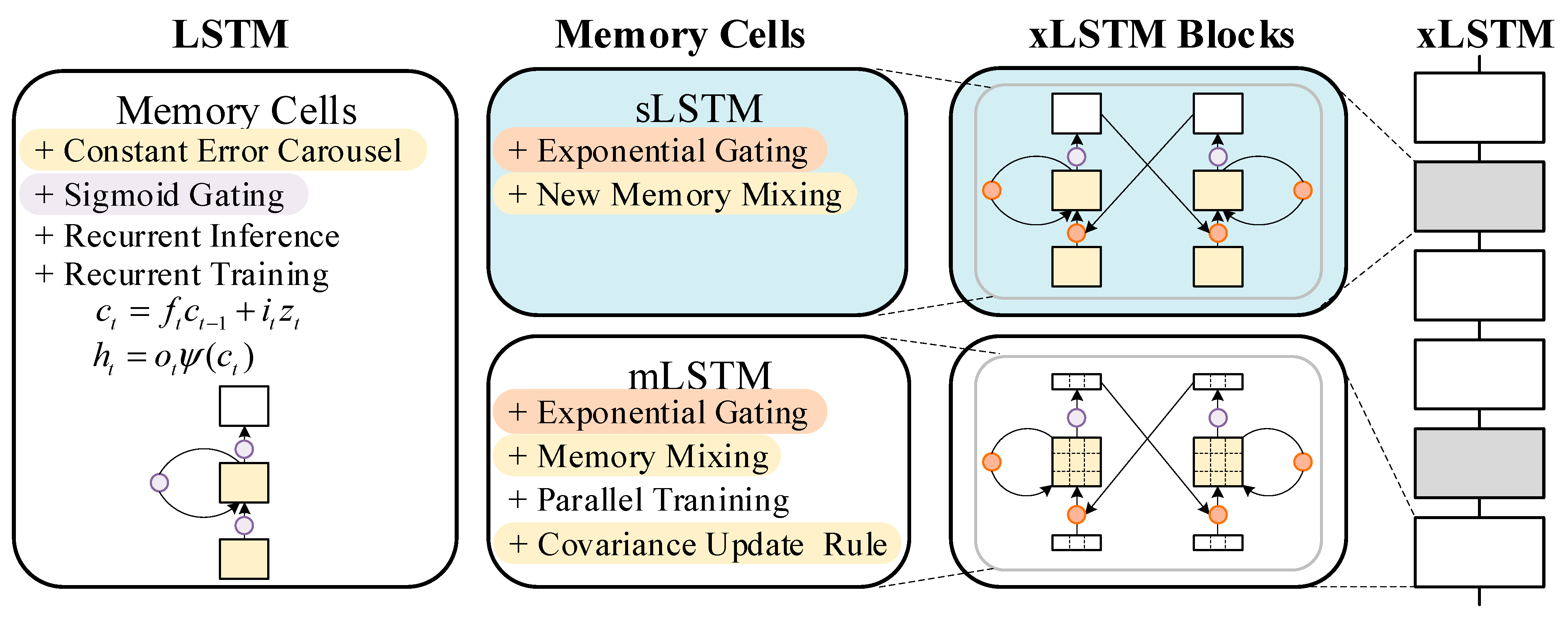 - Beck, M.; Pöppel, K.; Spanring, M.; Auer, A.; Prudnikova, O.; Kopp, M.; Klambauer, G.; Brandstetter, J.; Hochreiter, S. xLSTM: Extended long short-term memory. arXiv 2024, arXiv:2405.04517. [Google Scholar]