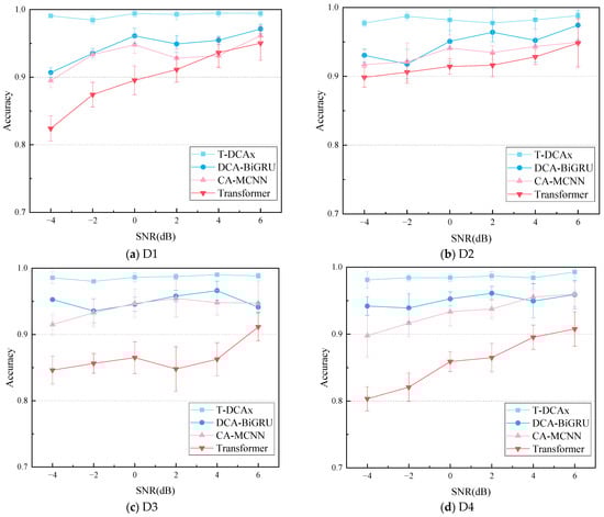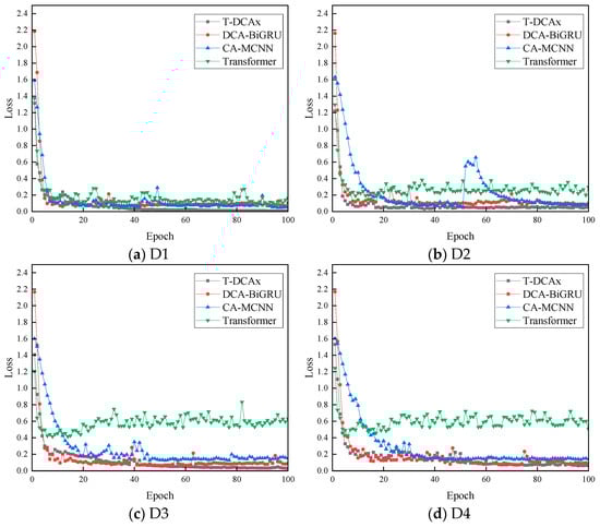 - Based on the proposed DCA-xLSTM structure, the encoder of Transformer is combined with self-attention to capture global dependencies, and the T-DCAx network is proposed. In this way, the network pays attention to the overall information and improves the fault diagnosis accuracy of the proposed method.