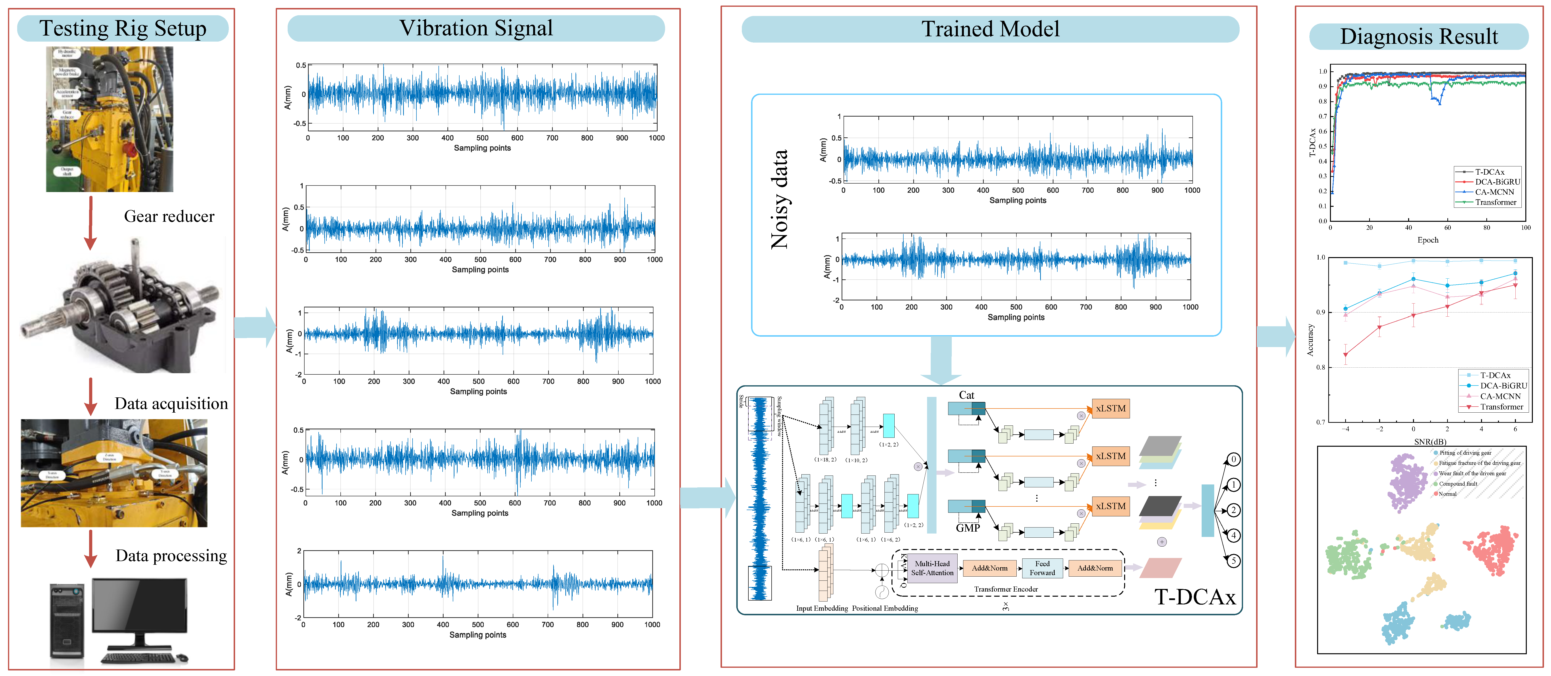 - A novel T-DCAx framework is proposed for gearbox fault detection, combining dual-path convolutional attention and xLSTM with Transformer to handle noise and complex conditions.