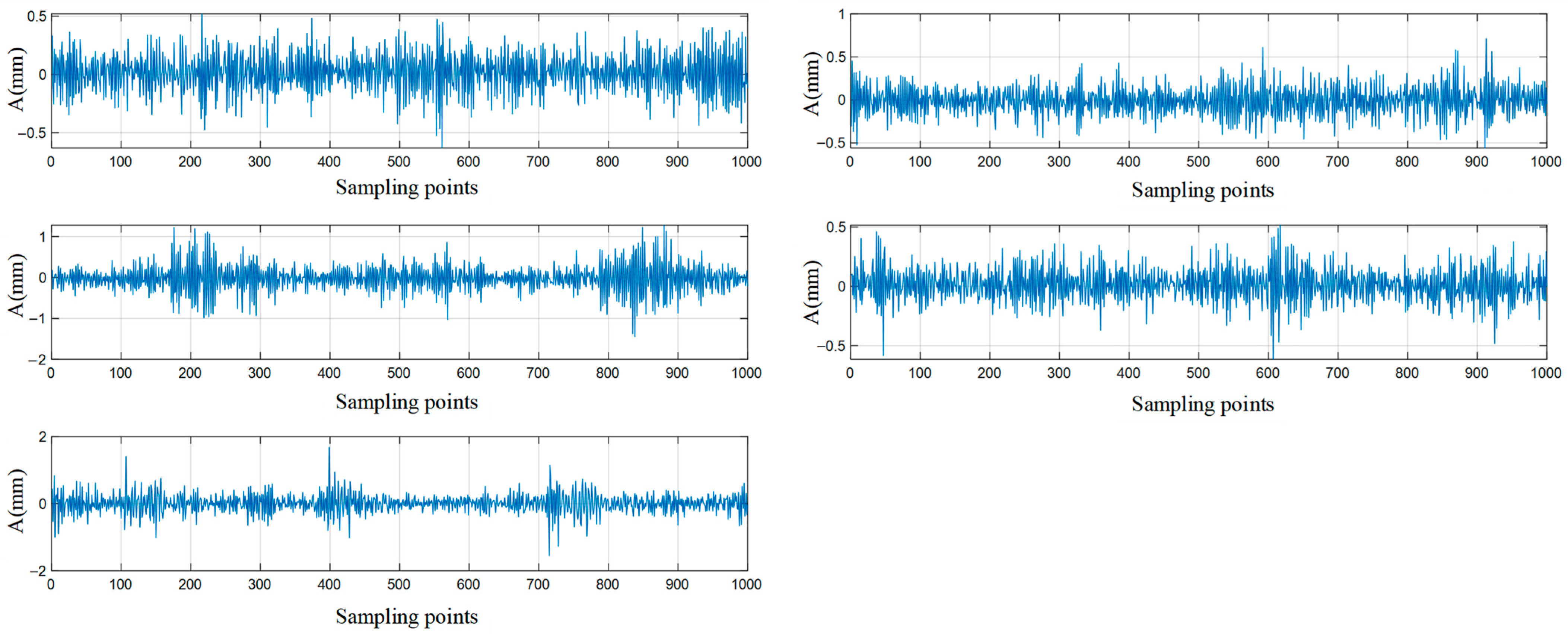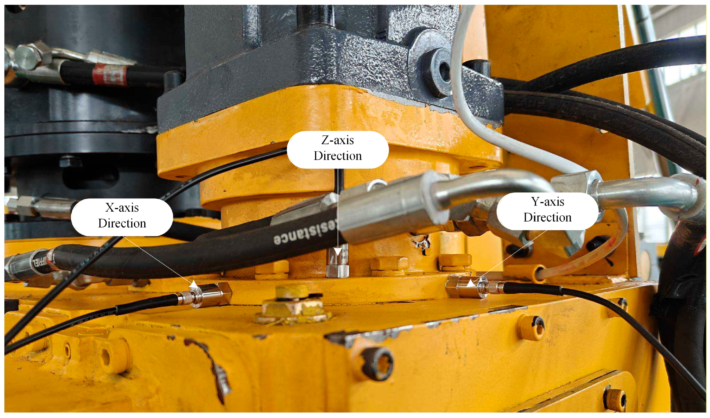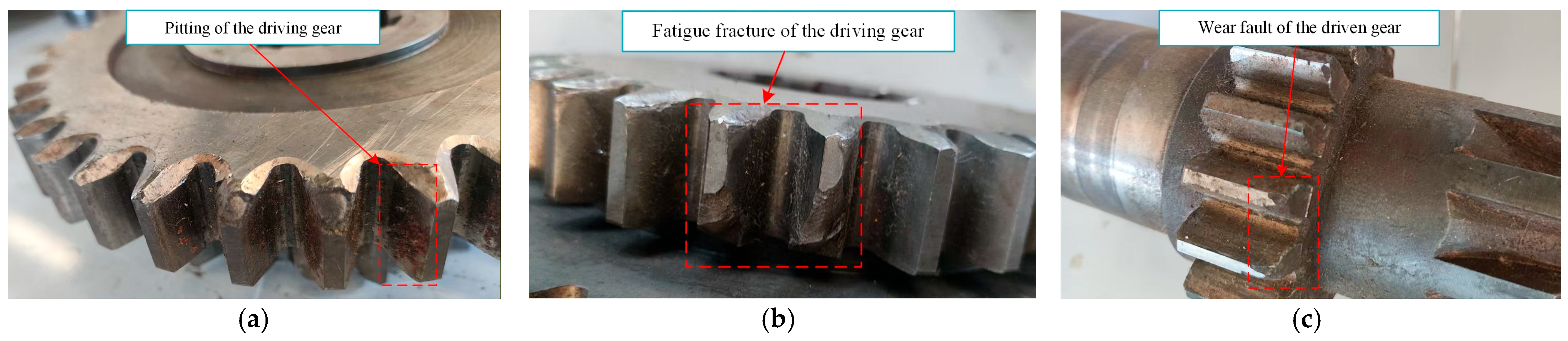 - Set the load torque to 0 N·m and motor speed to 590 rpm (working condition S5L0). Collect vibration signals from the faulty gearbox and repeat three times to ensure data reliability.