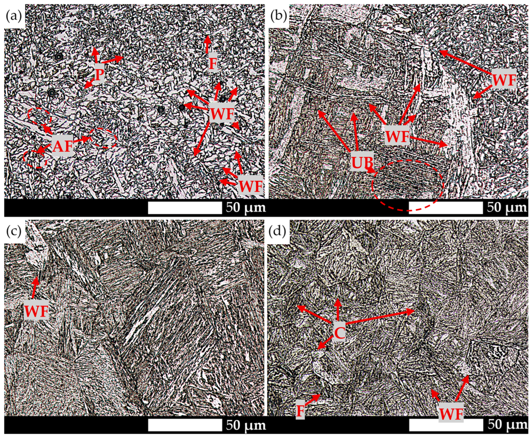 - The welded joint in the as-welded condition is characterized by a dendritic microstructure dominated by Widmanstätten ferrite, acicular ferrite, and allotriomorphic ferrite, with bainite and pearlite occurring only locally. The hardness of the weld metal ranges from 210 to 240 HV, corresponding to approximately 45% of the base material hardness (503 HV), which results in the lowest abrasive wear resistance (kb = 0.98 ± 0.01).
